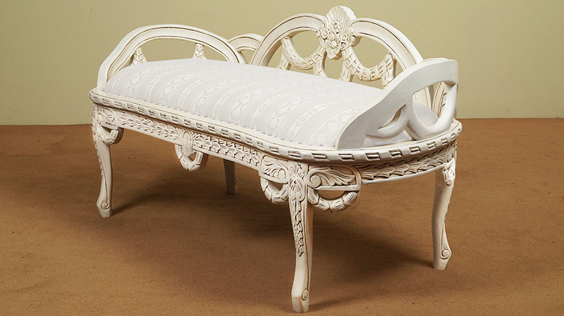 Меблі виготовлені з добірного масиву червоного дерева найвищої якості, пофарбовані білою фарбою. Ця модель характеризується ретельною, трудомісткою різьбою, виконаною з максимальною увагою до деталей найкращими майстрами.
