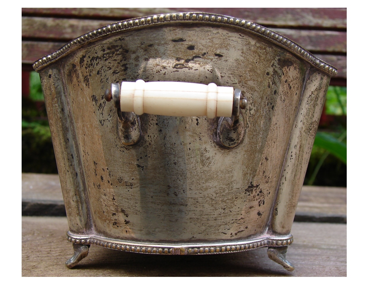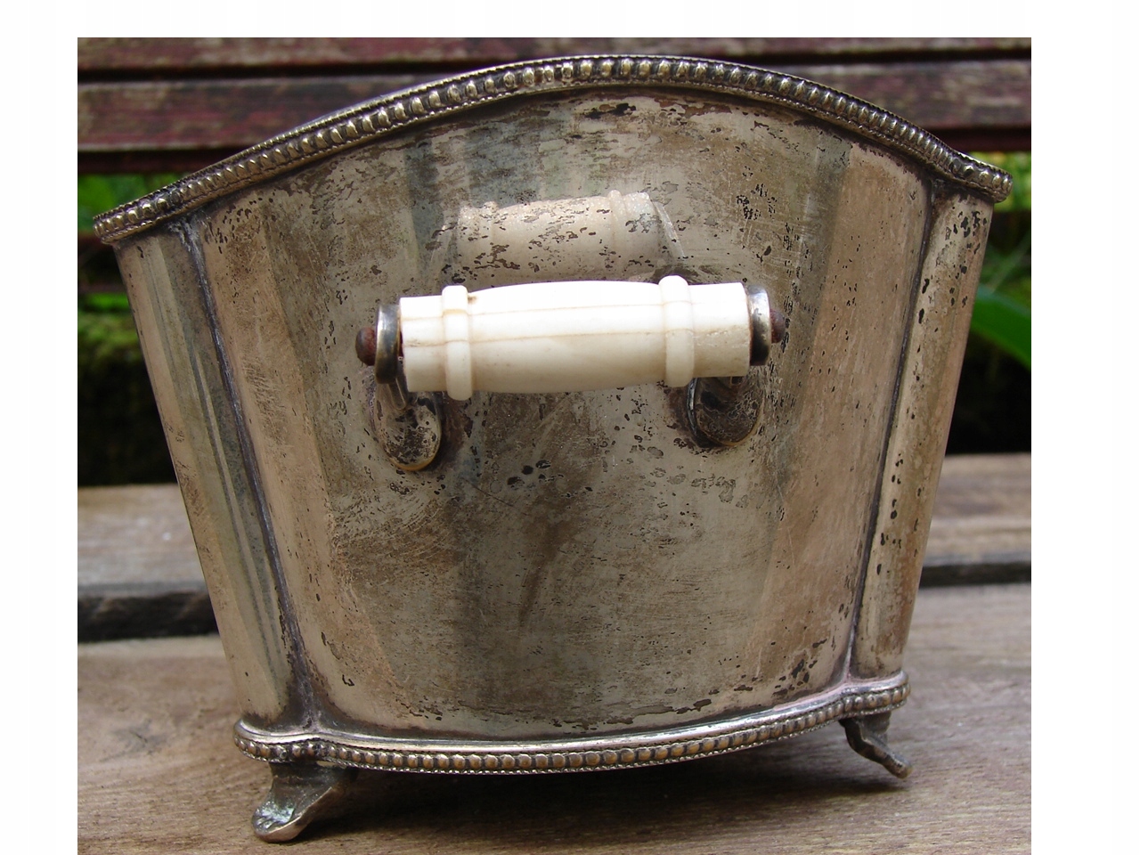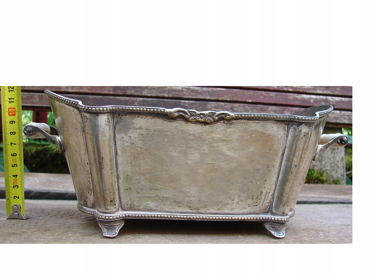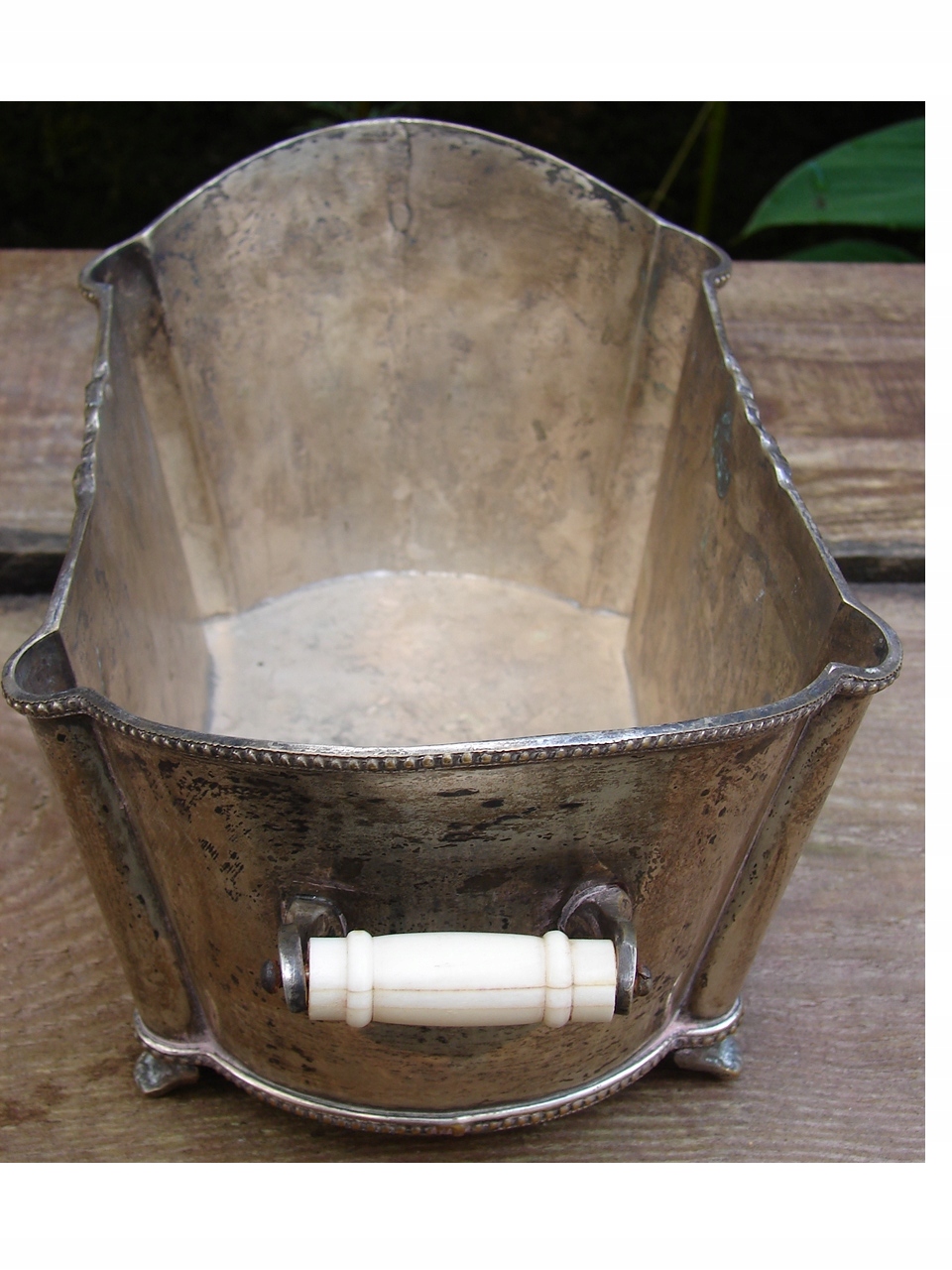 декоративний горщик, виготовлений у стильній формі, що підтримується на ручках чотирьох футів, виготовлених з матеріалу, що імітує слонову кістку. Пункт, виготовлений з латуні, покрита тарілкою зі сріблом.