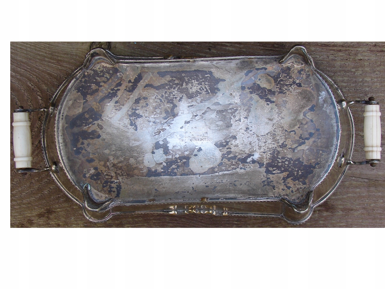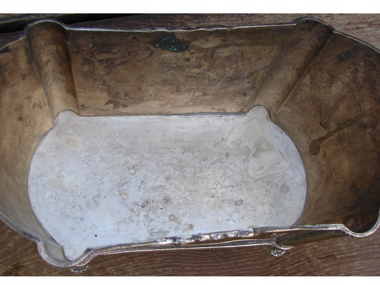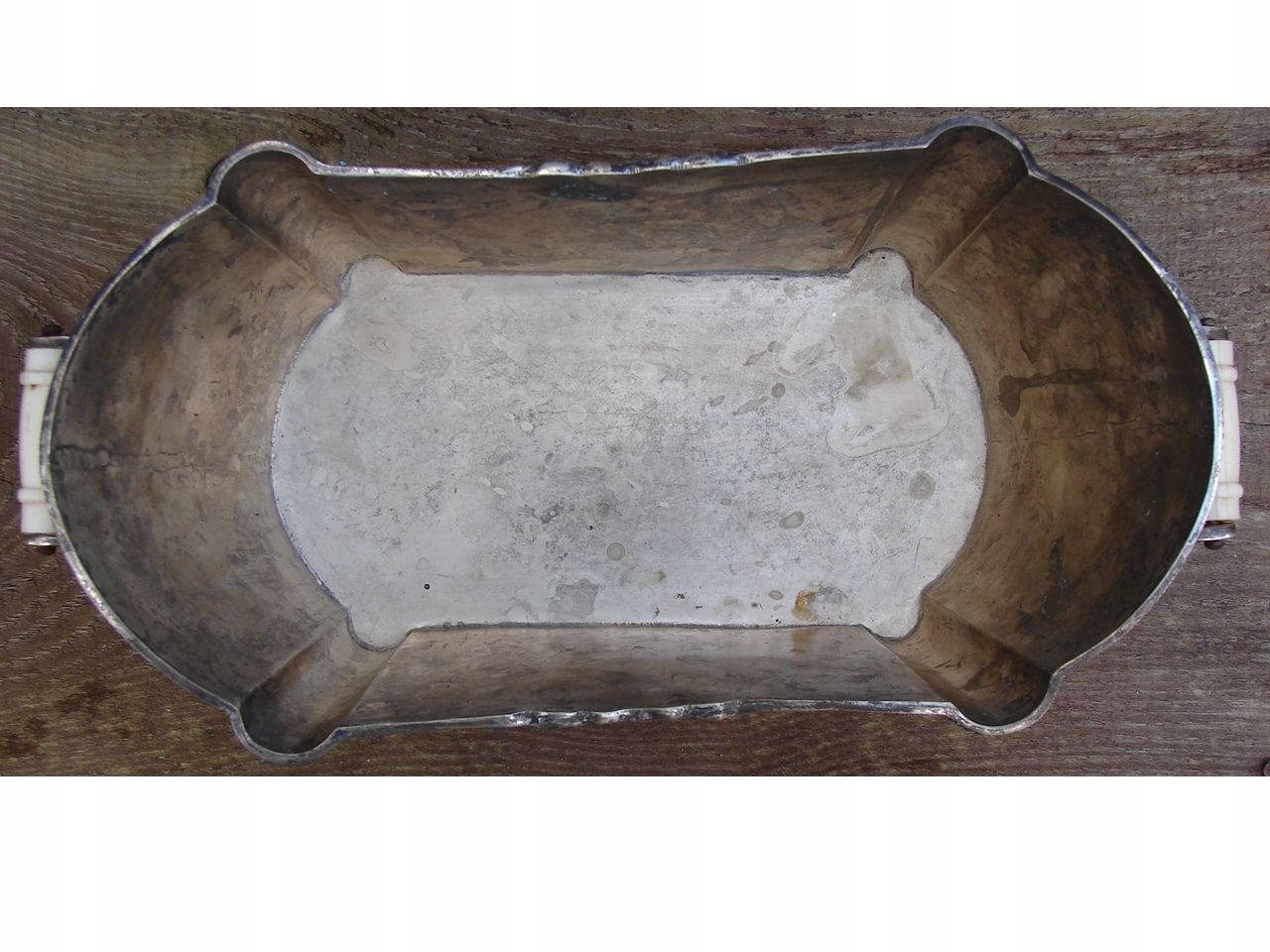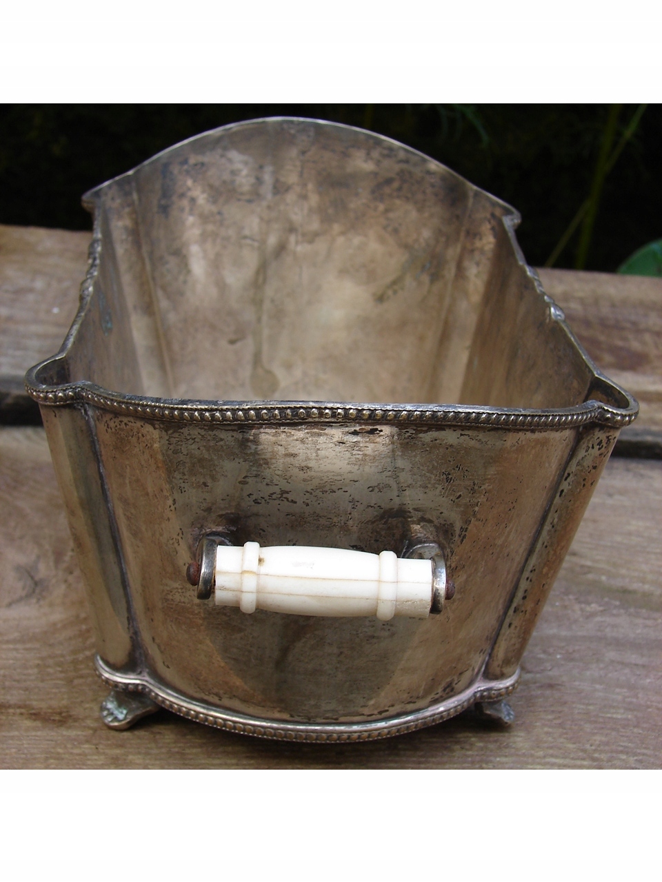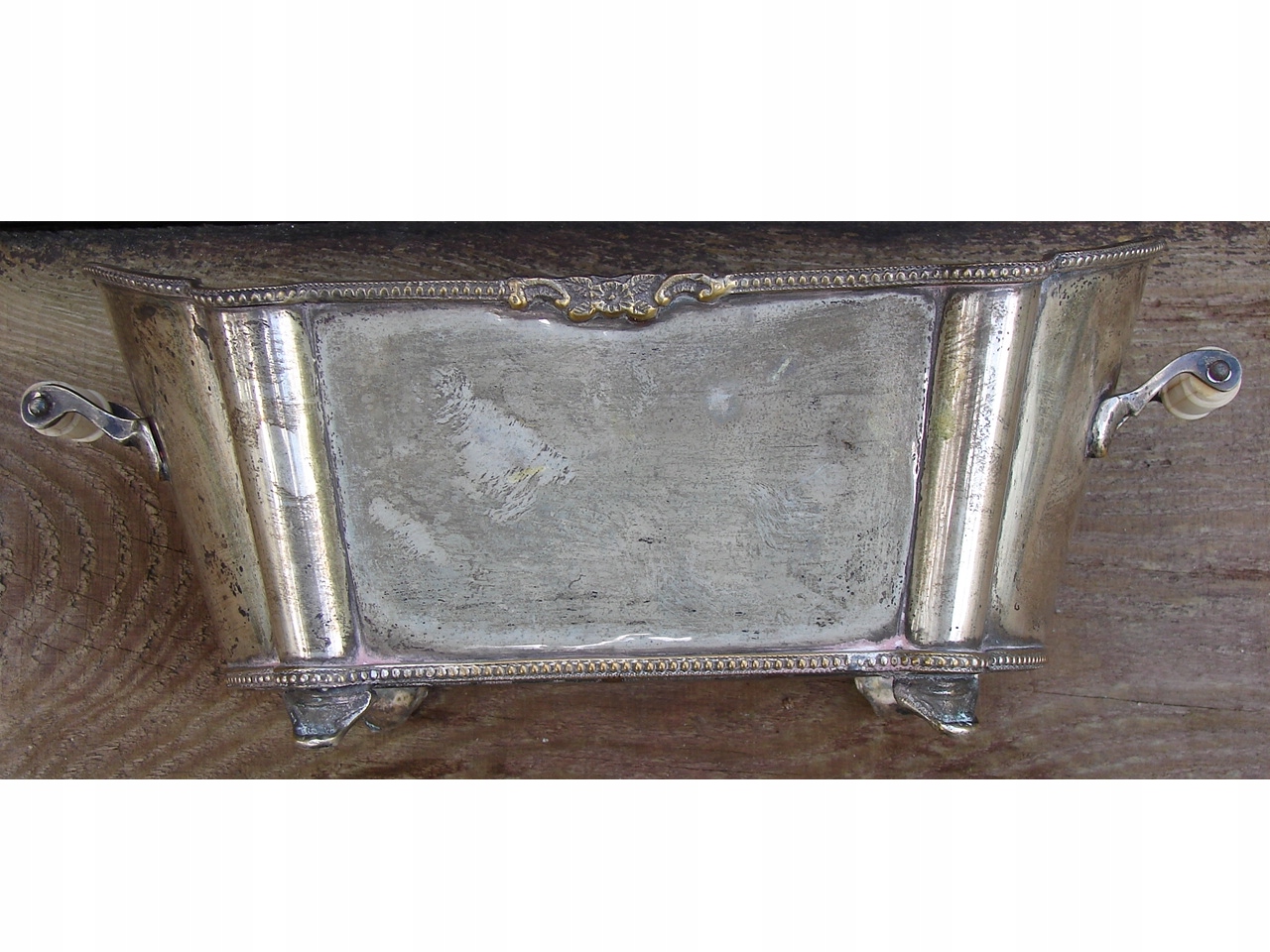 декоративний горщик, виготовлений у стильній формі, що підтримується на ручках чотирьох футів, виготовлених з матеріалу, що імітує слонову кістку. Пункт, виготовлений з латуні, покрита тарілкою зі сріблом.