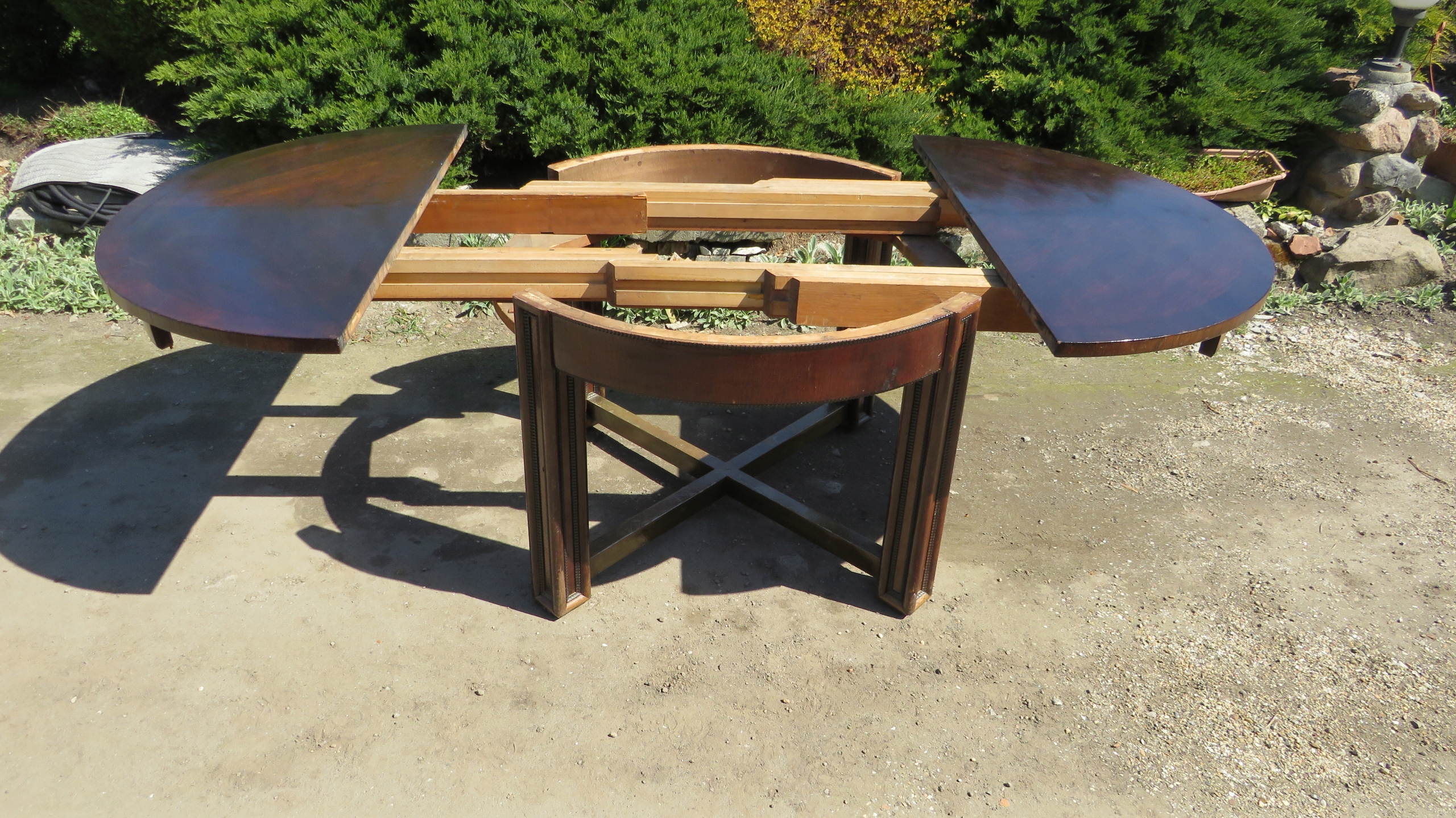 Стіл ART DECO стан як на фото, потребує ремонту, без допоміжних стільниць: висота: 77 см, стільниця: 125 см, в розкладеному вигляді приблизно 350 см.
