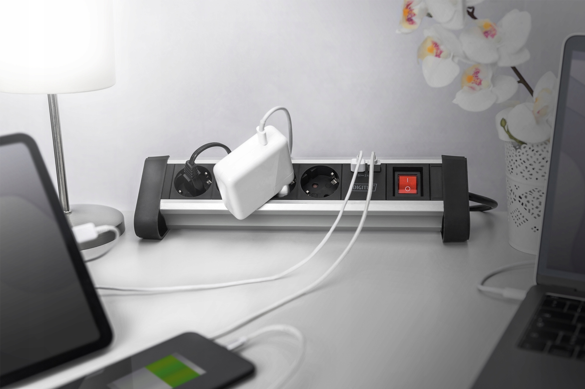 Офісний подовжувач живлення Digitus® має чотири електричні розетки Schuko та два порти USB для заряджання мобільних пристроїв.