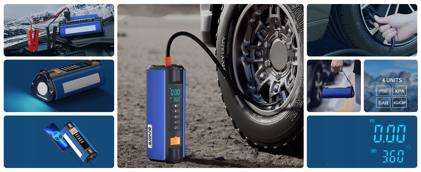 ✅ пристрій для запуску автомобіля ✅ бездротовий електричний насос ✅ Powerbank ✅ Ліхтарик ✅ Ретельний акумулятор 1000 мАг ✅ Чіткий РК -дисплей ✅ тиск до 10bar