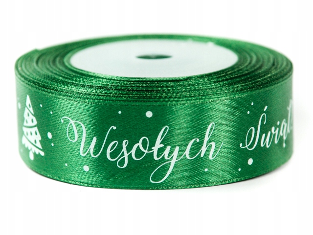 СТРІЧКА АТЛАСНА З РІЗДВОМ - 25 мм - ЗЕЛЕНА