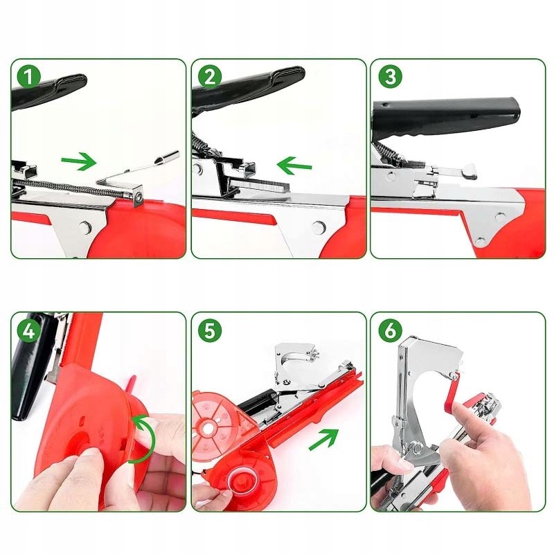 5⃣ Перекладіть стрічку через механізм різання - передайте стрічку через спеціальний механізм затискання. Шиття - натисніть руку степлера, щоб захистити рослину.