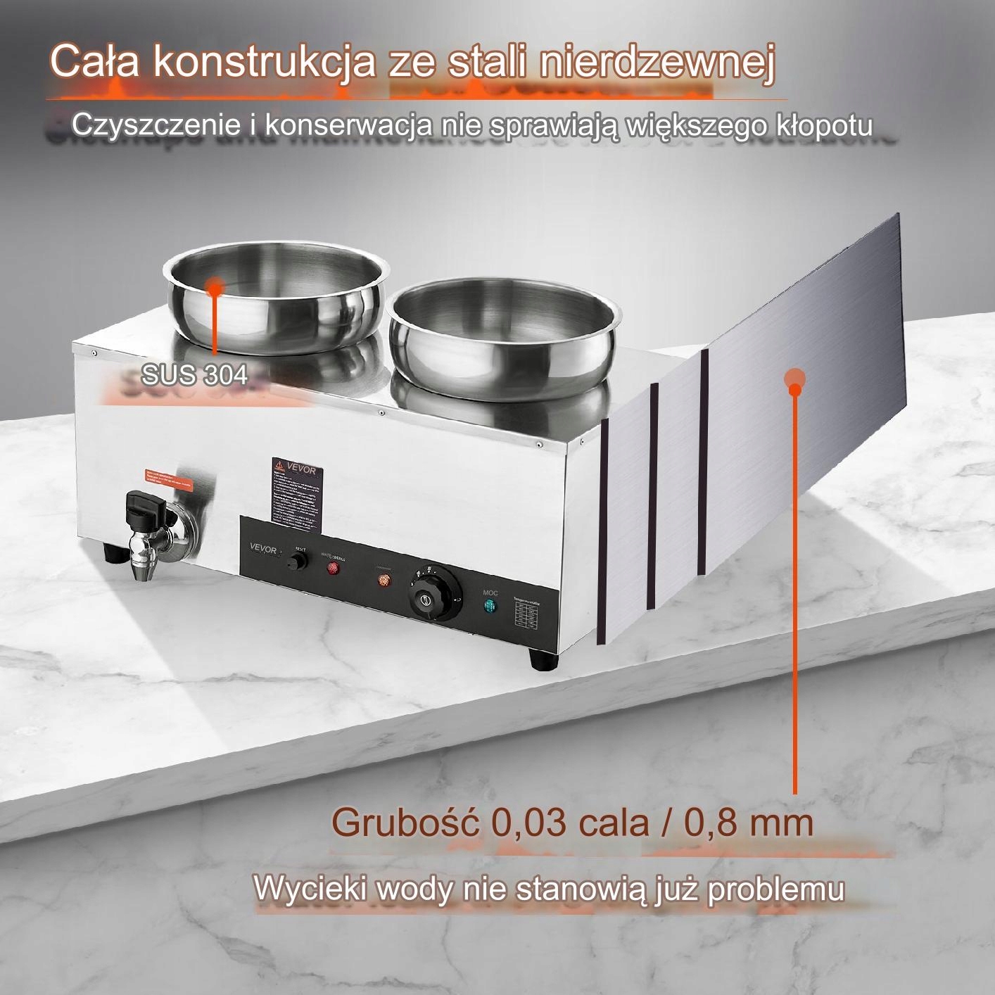 Нагрівач містить маркери рівня води всередині. Контейнер має кран, який дозволяє зливати воду після використання, що зменшує необхідність очищення внутрішньої частини пристрою. Крім того, у набір входять два дуже довгі черпаки, ідеальні для глибоких каструль.