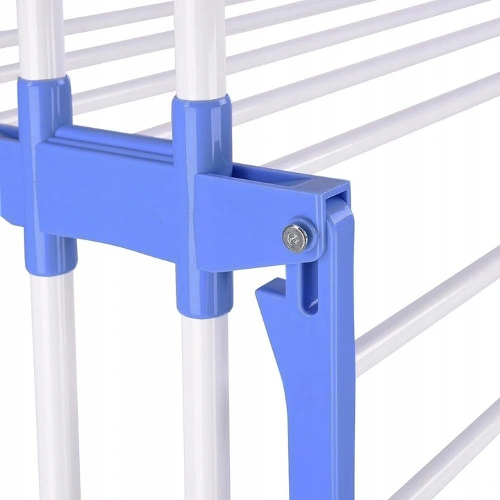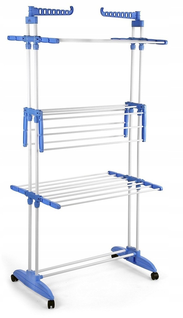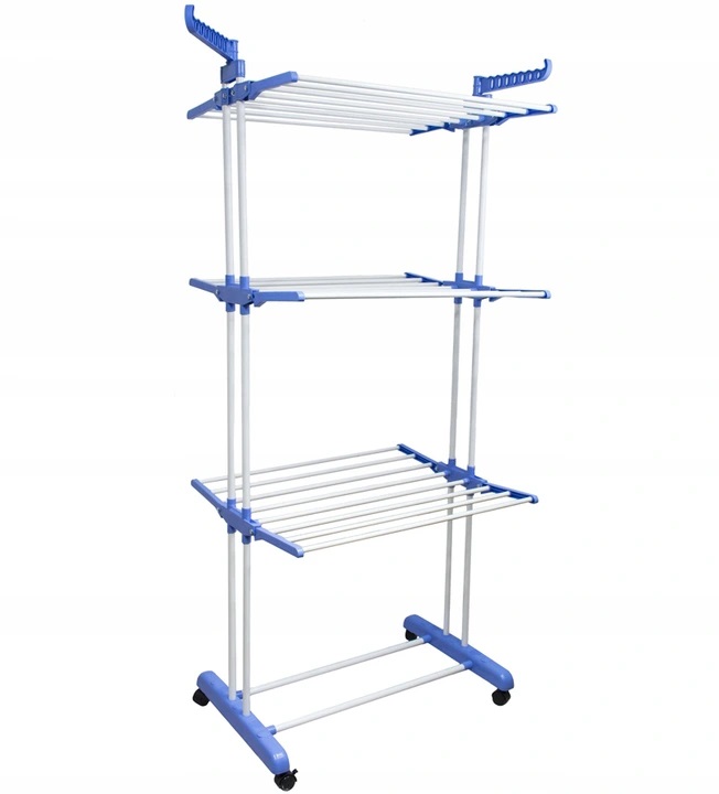 Стійка конструкція двоповерхової сушарки для білизни та міцні труби дозволяють розвісити на ній дуже велику кількість білизни. На двоярусну стійку для білизни можна повісити до 35 шт. кг мокрого одяга. Сушарка для білизни має 3 рівні та зручну та практичну нижню полицю для аксесуарів. На 3 рівнях є цілих 24 труби, на які можна повісити мокрий одяг і білизну. Трубки міцні та стійкі до корозії, тому сушарка прослужить довго. Також є дві висувні ручки, на які можна повісити 14 вішалок. Нижня полиця ідеально підійде для зберігання пряжок або сушіння взуття.