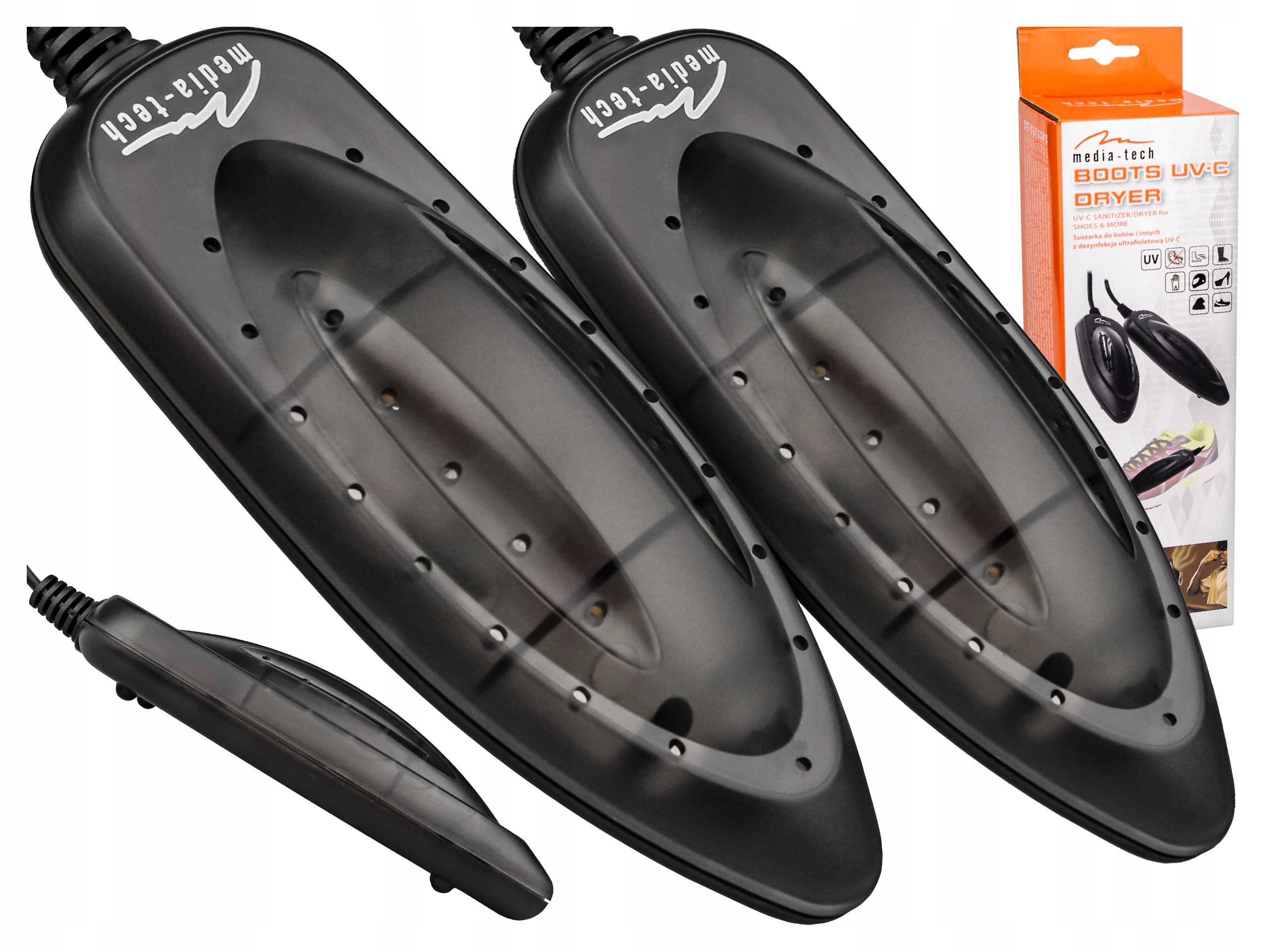 Сушильна машина складається з двох кінців, з’єднаних кабелем і вилкою. Вставляємо наконечники глибоко в взуття, вставляємо вилку в розетку і починається процес сушіння. Сушарка для взуття працює як фен, але має форму, що підходить для взуття, і працює самостійно. Просто увімкніть його та залиште у взутті, і волога швидко випарується, а головне – не матиме жодних негативних наслідків для взуття.