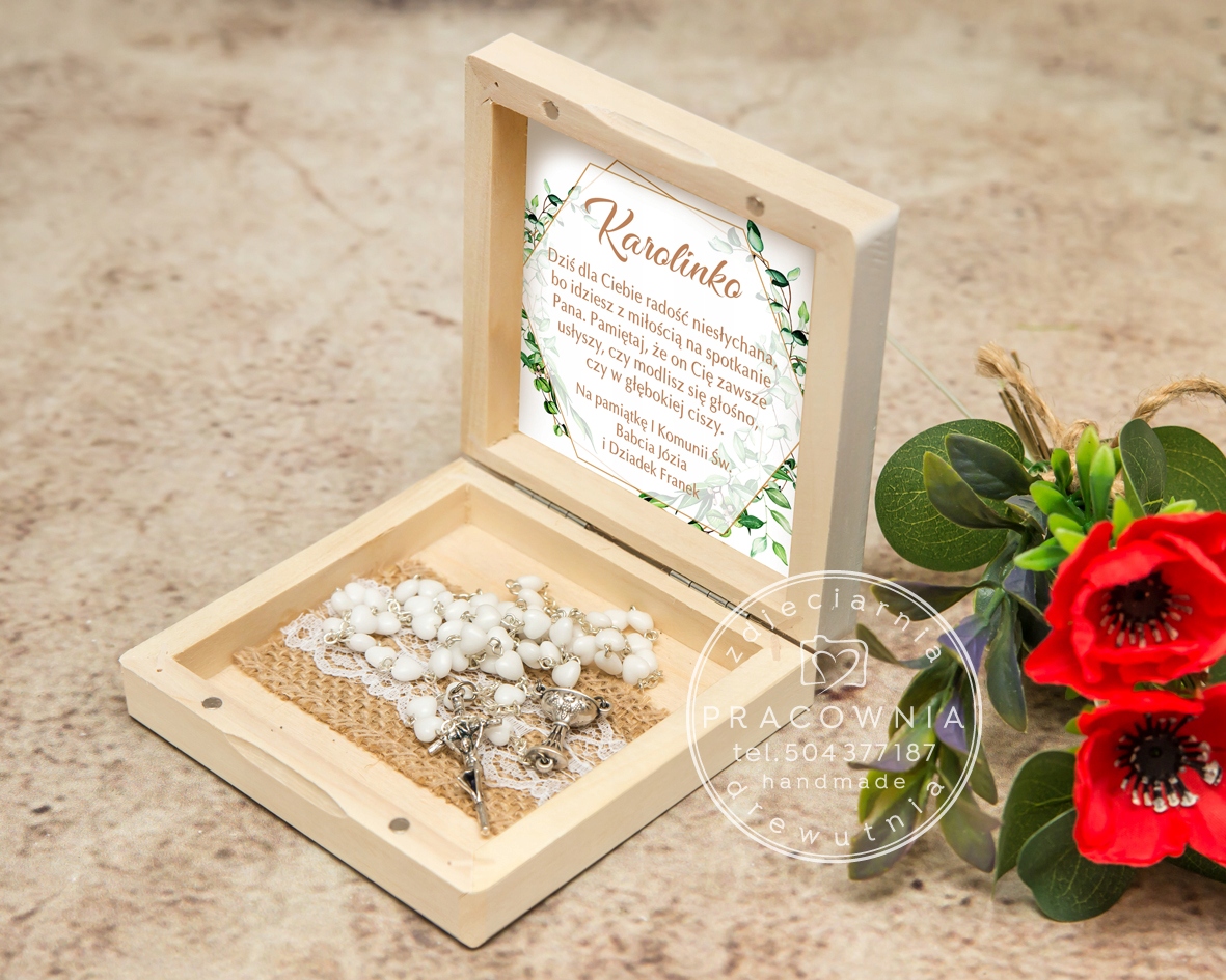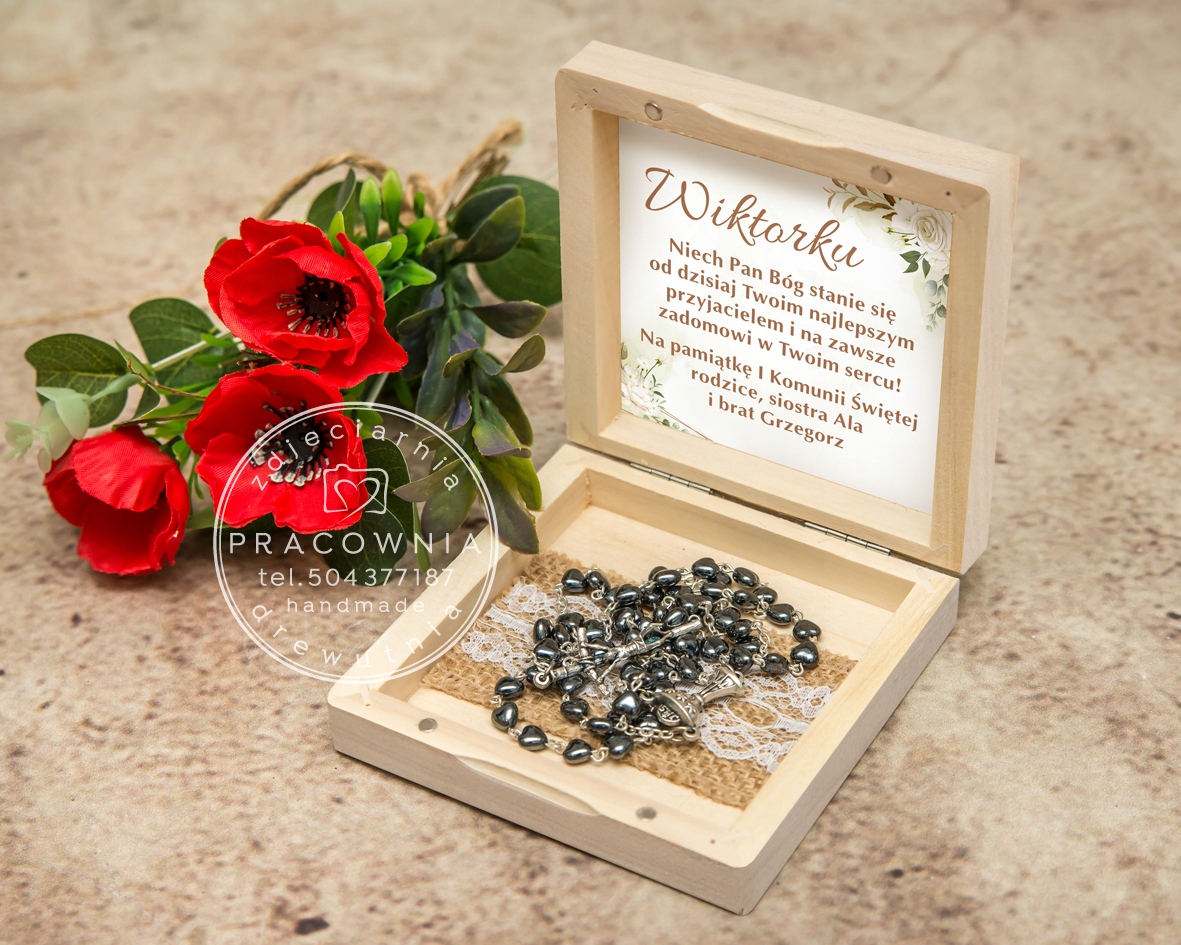 Дерев'яна скринька з красивою вервицею (сердечками) на пам'ять до Святого Причастя. для дитини чи подяка хресним батькам чи бабусям і дідусям.