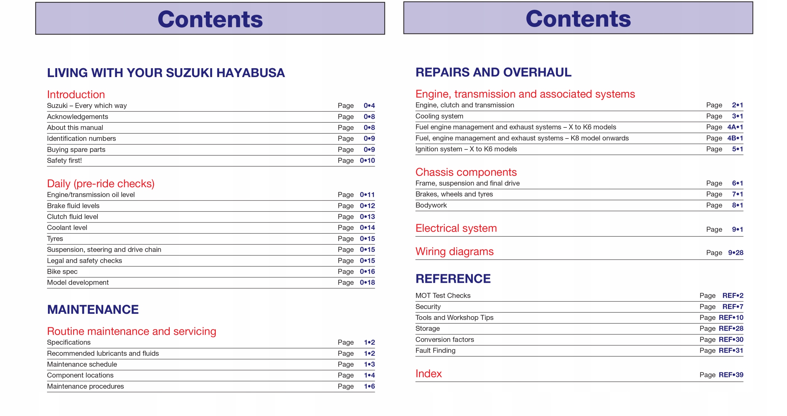 Видання містить інформацію про конструкцію, ремонт і методи обслуговування мотоцикла Suzuki GSX1300R Hayabusa . У книгу входять наступні моделі: