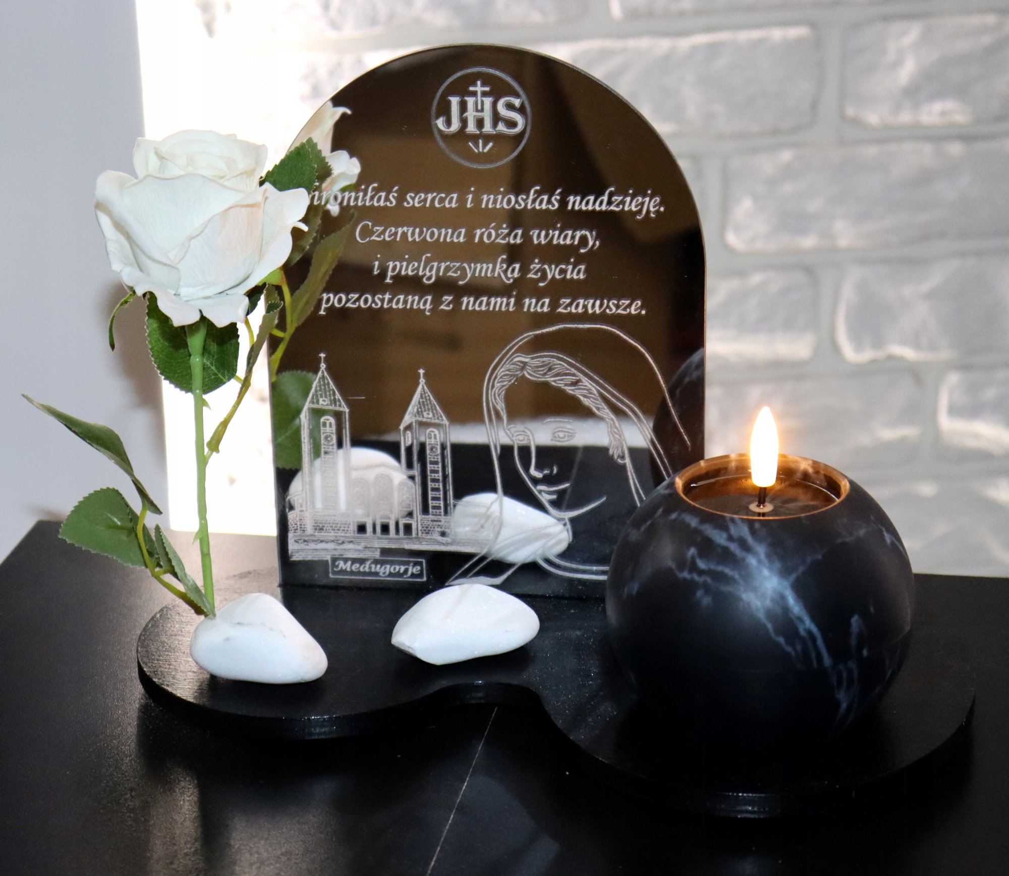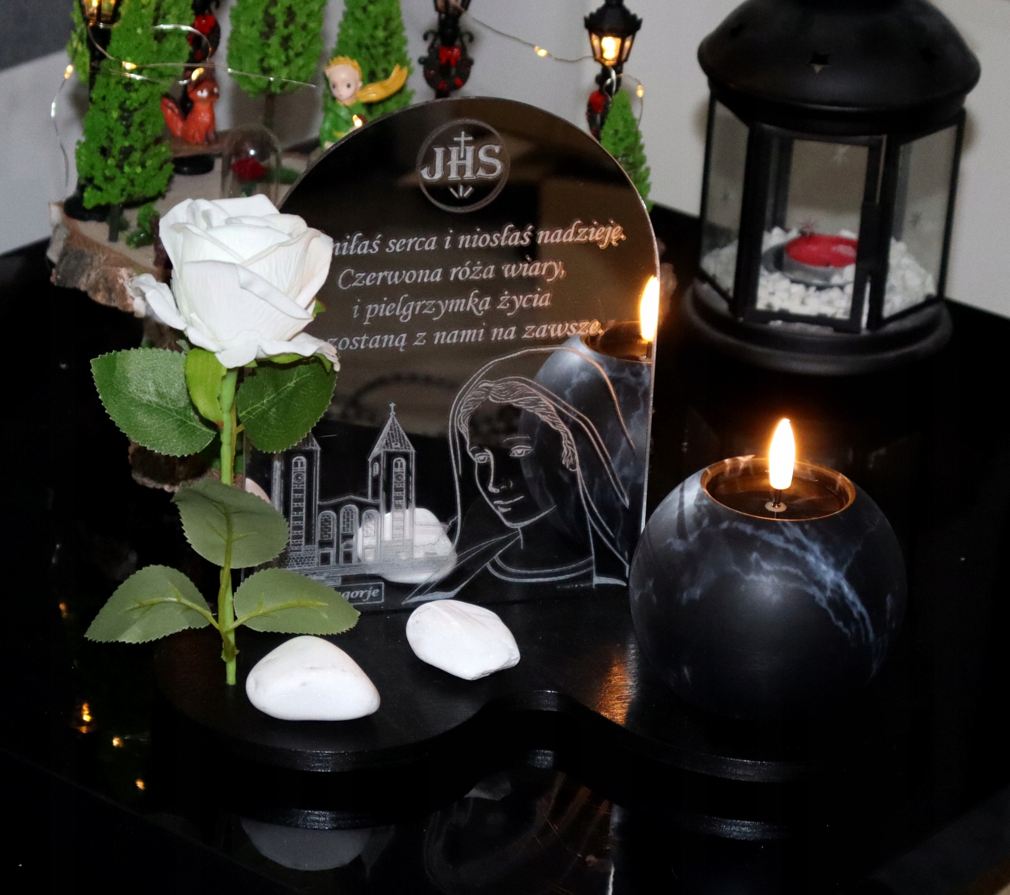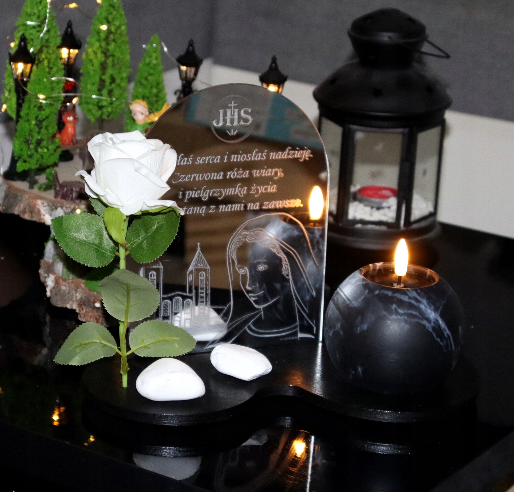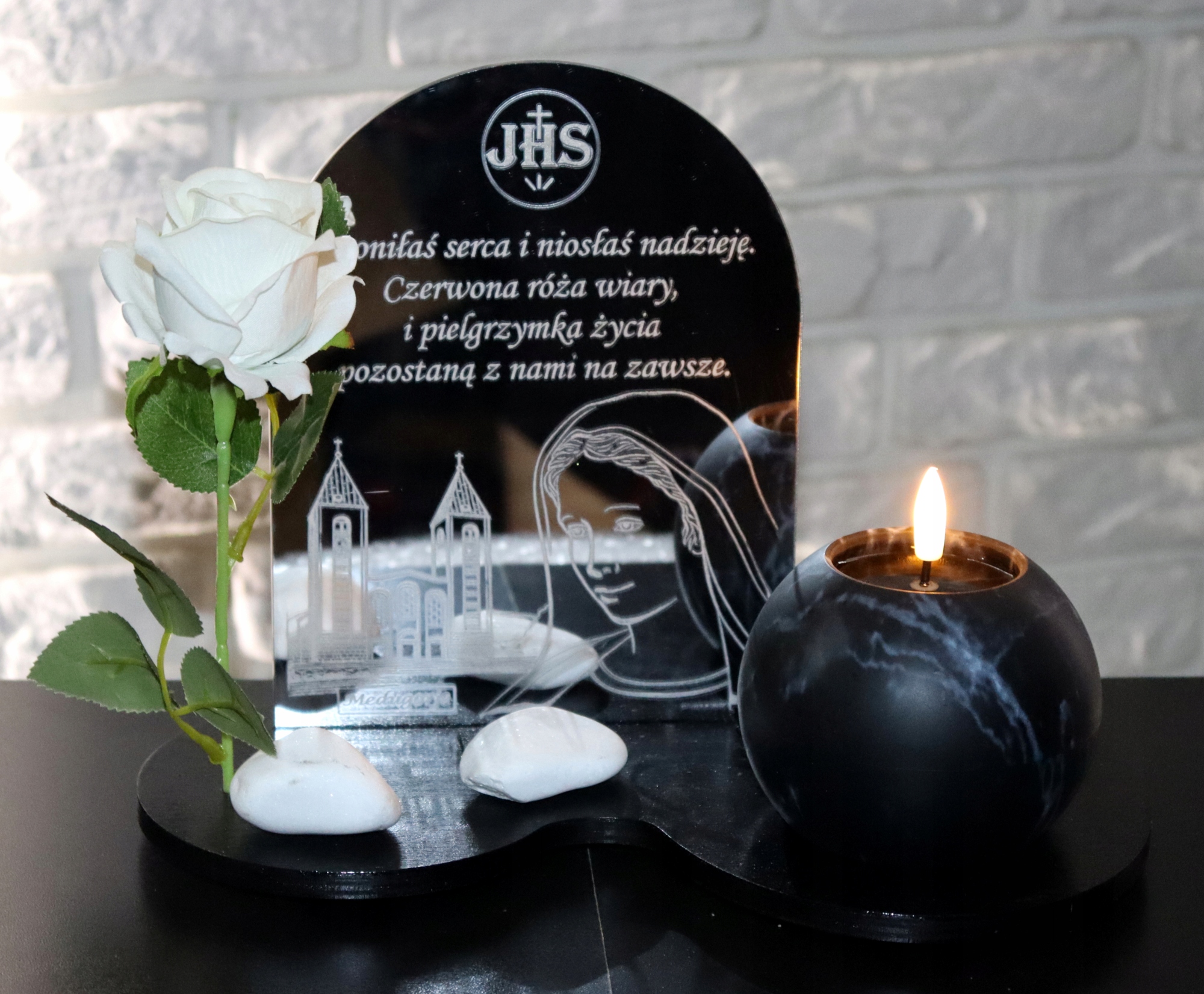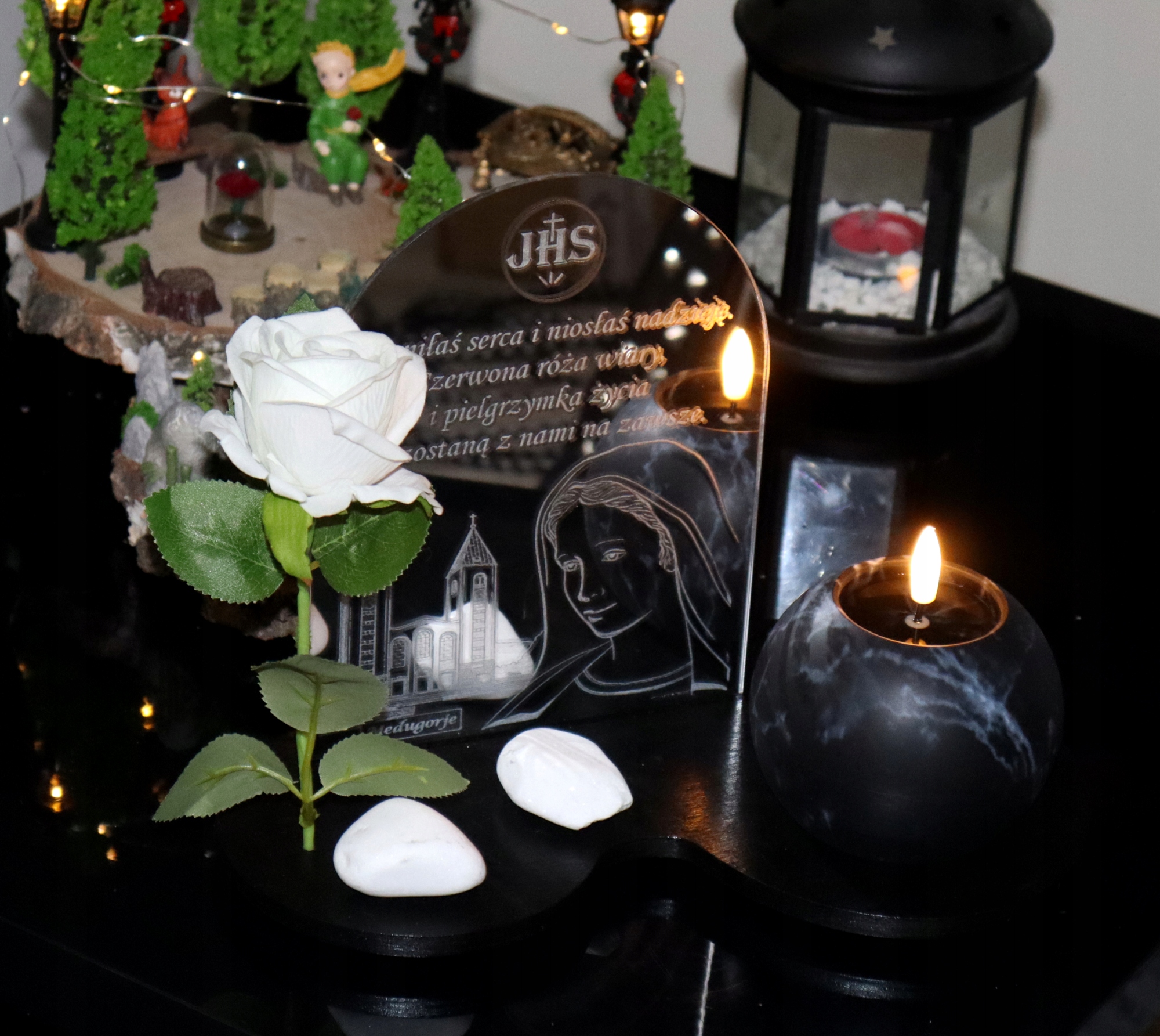 Прикраса доповнюється дзеркальна пластина з оргскла, на якій ми можемо вигравірувати будь-який вміст, що додає неповторного характеру всьому.