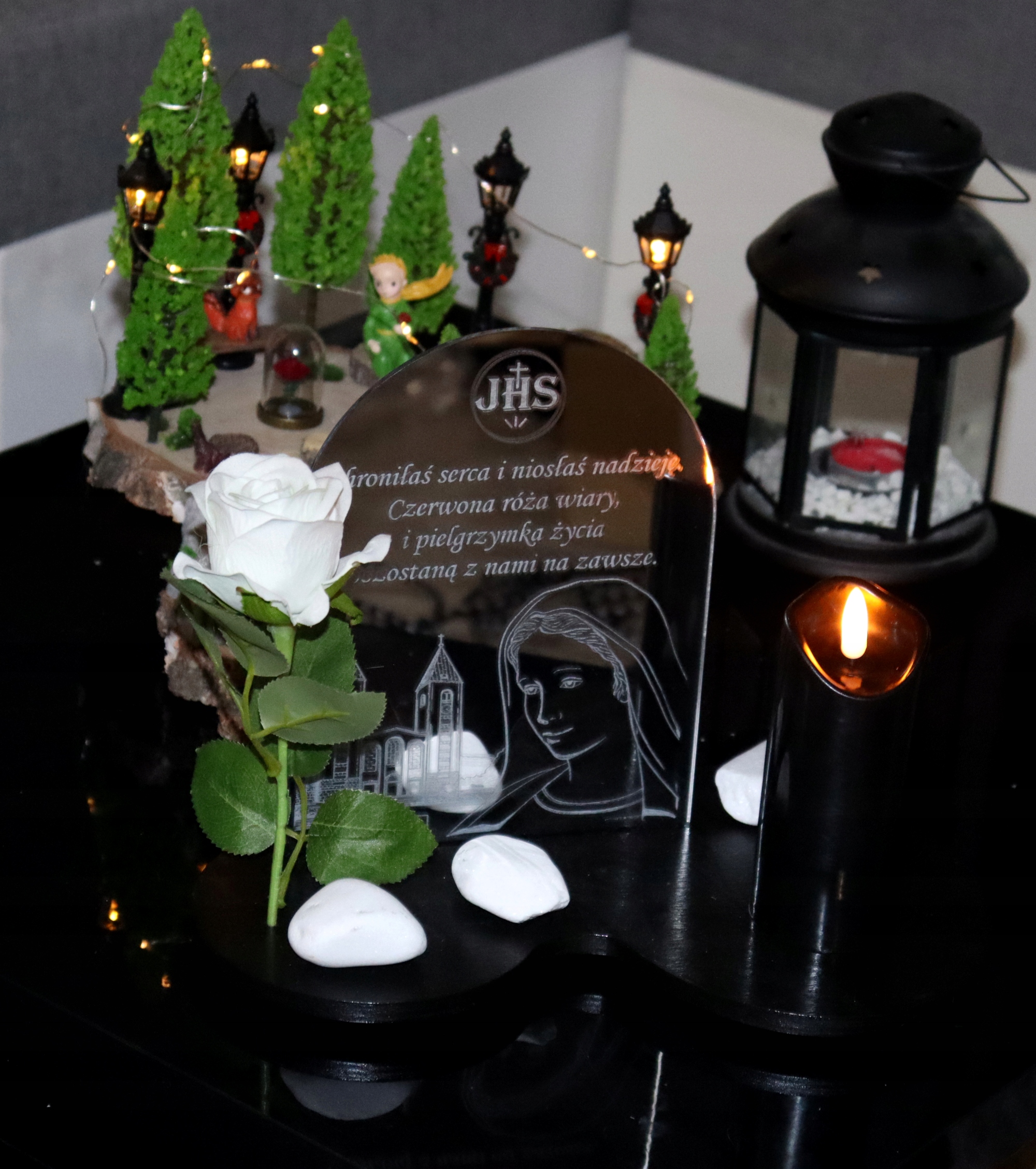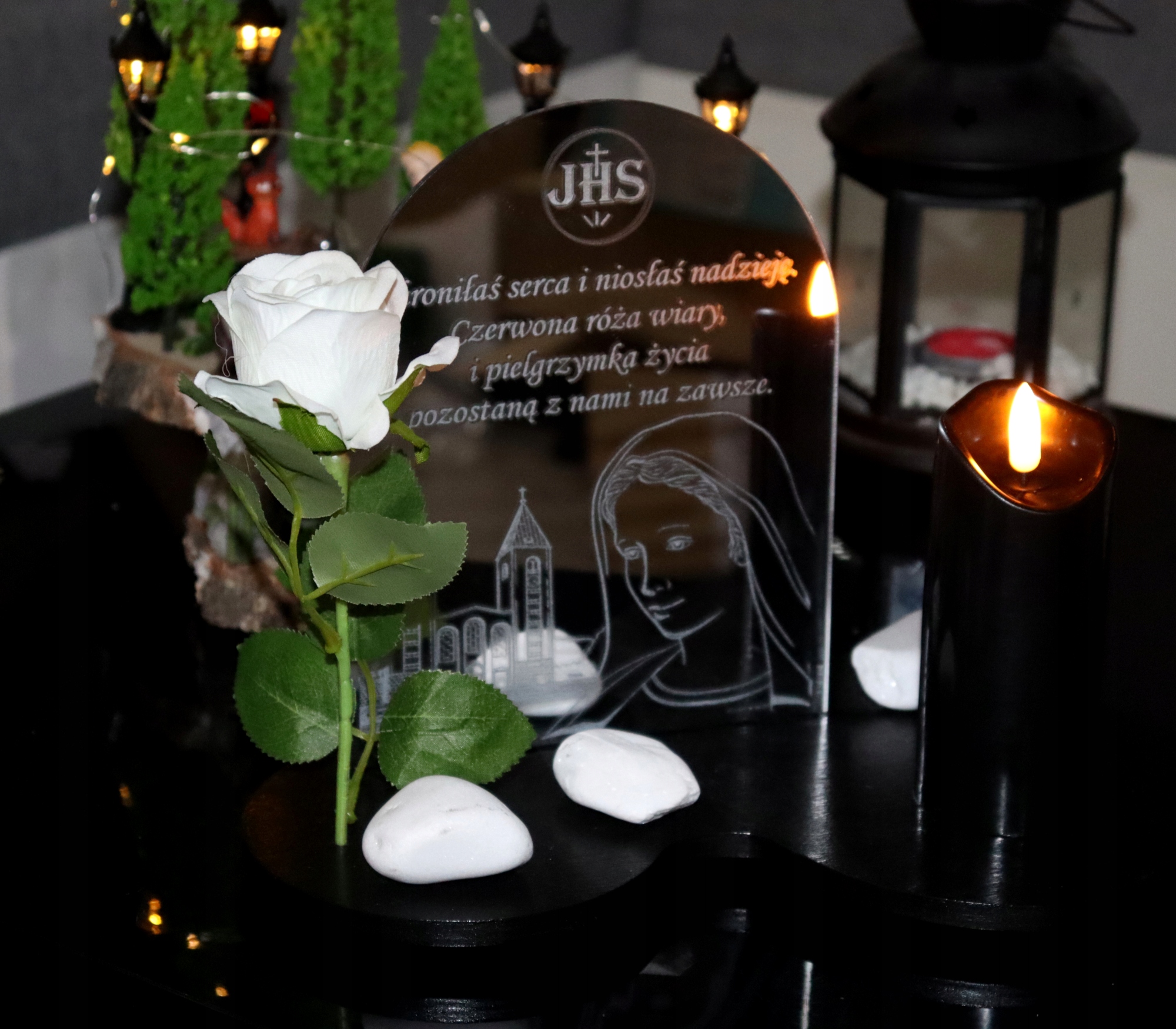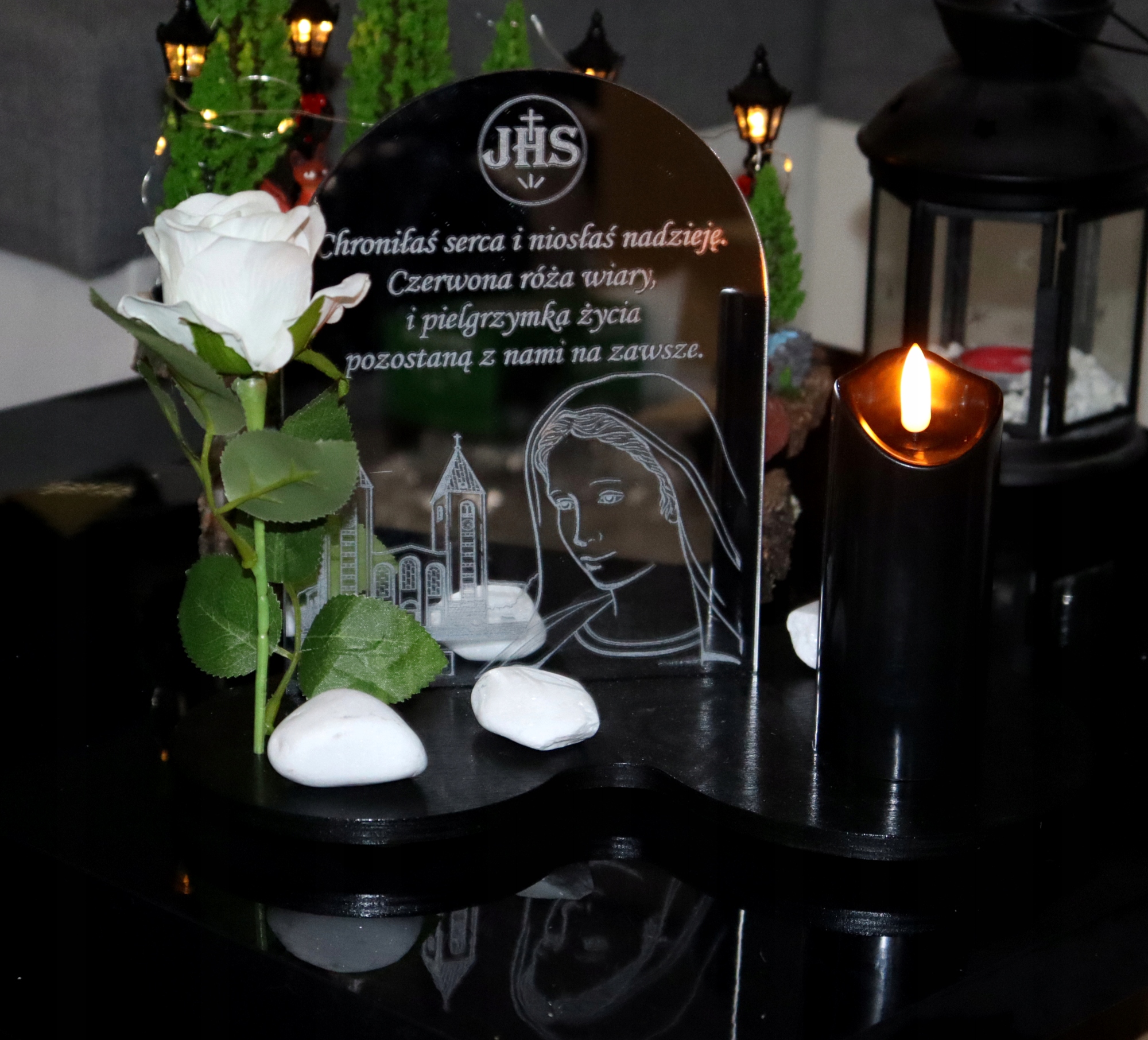 Прикраса доповнюється дзеркальна пластина з оргскла, на якій ми можемо вигравірувати будь-який вміст, що додає неповторного характеру всьому.