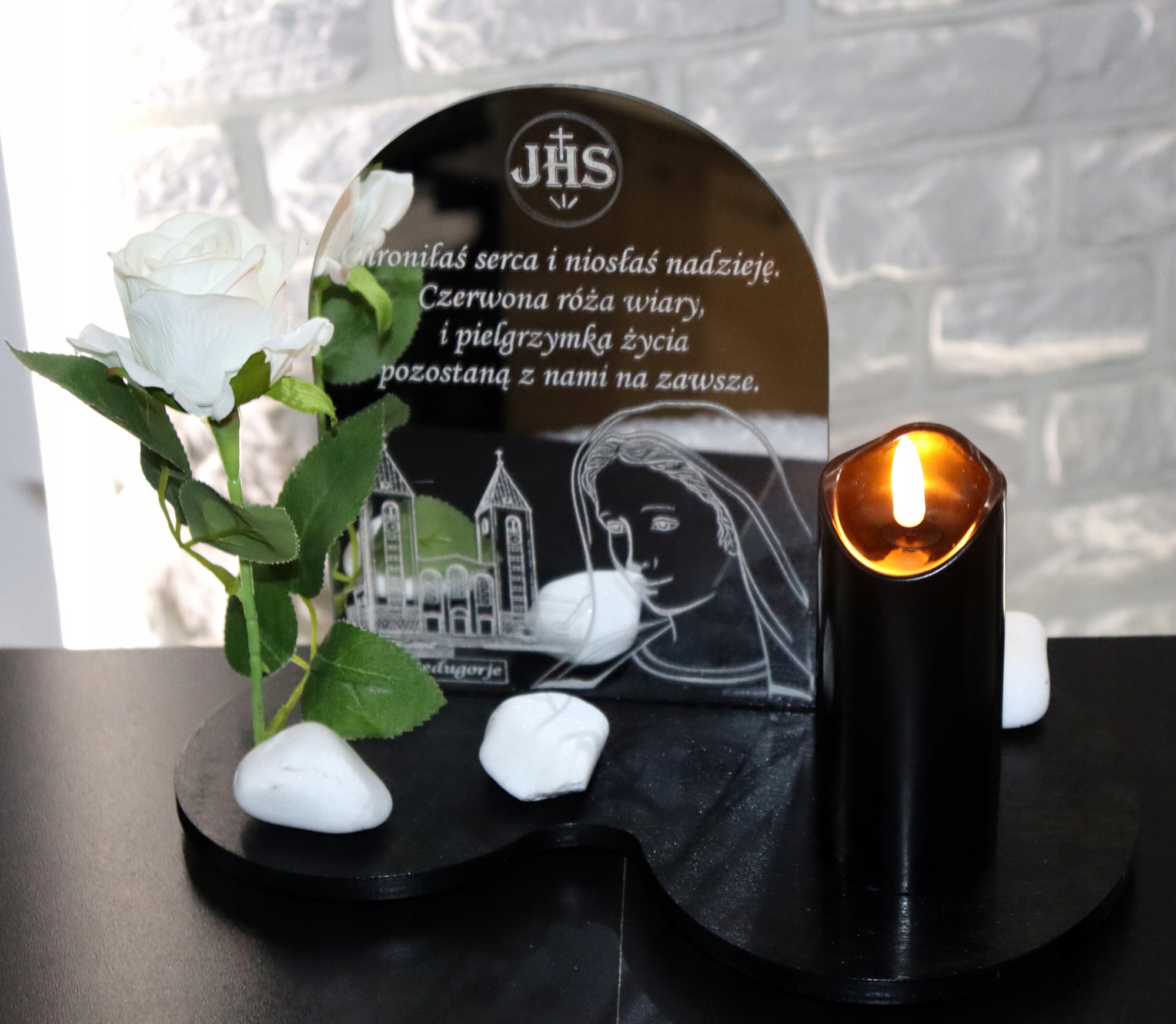 Свічка розміщена на твердій основі з ніжками з березової фанери, пофарбованої в колір темного дерева . В основі також вбудована біла оксамитова троянда, яка робить його унікальним завдяки своїй реалістичності. Це ідеальний вибір для могили близької людини, який завдяки заряду акумулятора є екологічним і водночас гарним духовним сувеніром.