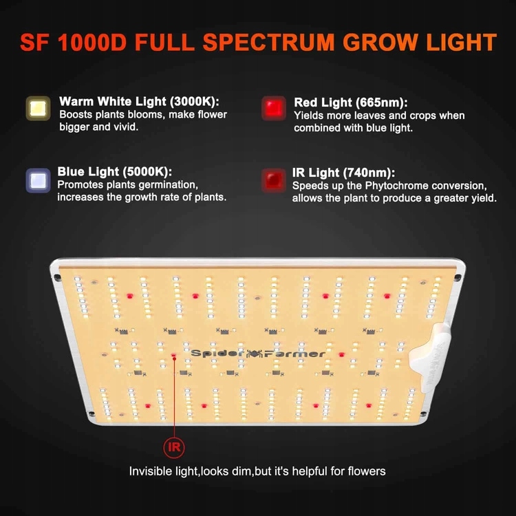 Світлодіодна лампа Spider Farmer SF-1000-D — це сучасне рішення для любителів вирощування рослин, яке поєднує в собі передову діодну технологію від Samsung (LM301B) з енергоефективністю та ефективністю у стимулюванні росту рослин. Завдяки ефективності 2,5 мкмоль/Дж і діапазону освітлення 90x90 см для росту і 60x60 см для цвітіння, відповідно, ця лампа ідеально підходить для невеликих і середніх культур. Він споживає лише 100 Вт, що на 50% менше, ніж традиційні системи HPS або CMH, і водночас підвищує ефективність збору врожаю на 50%.