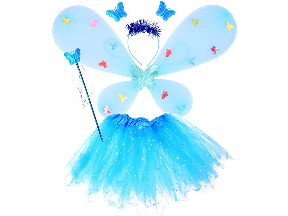 Костюм для невеликої феї або метелика порадує багато маленької принцеси. Набір оснащений прекрасною спідницею з тюлю на еластичній смузі, яка покрита маленькими срібними зірками та крилами, до яких прикріплені невеликі барвисті метелики, смуга та паличка. Світлодіодні світильники були поміщені в спідницю та крила. Костюм чудово підходить на костюмному балі під час шоу дитячого садка, на домашній вечірці.