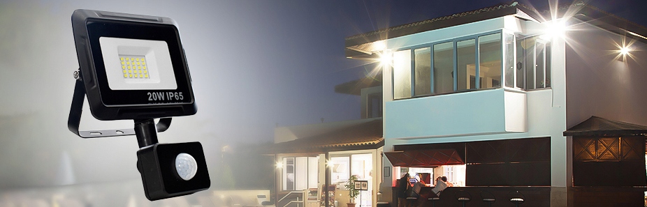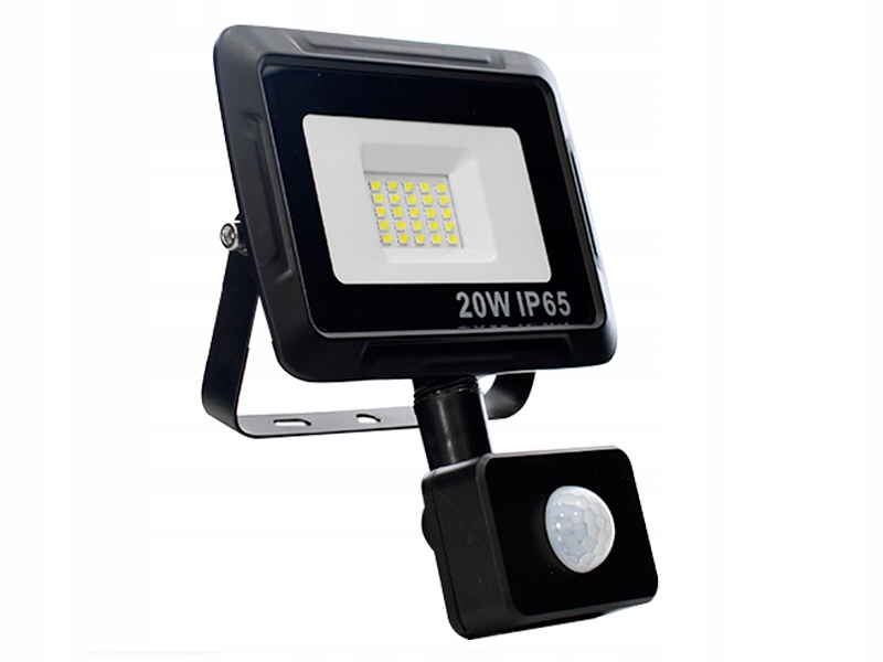 Світлодіодний прожектор/рефлектор потужністю 20 Вт, класом герметичності IP65 і нейтрально-білим (денне) кольором світла 4500K з датчиком руху та сутінків.