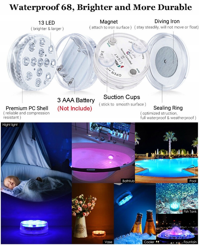 вишукана робота: Лампа басейну виготовлена з блискучого прозорого покриття PS, стійкого до споживання та падіння, без тріщин, стійких до води та корозії. Батареї AAA (не включені). Корпус лампи оснащений присоскою та магнітом, які легко встановити та експлуатувати.