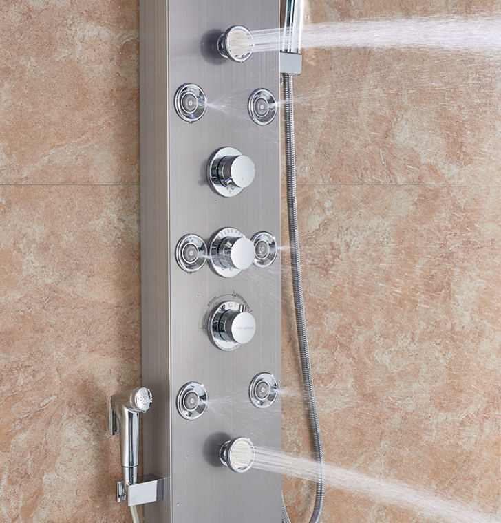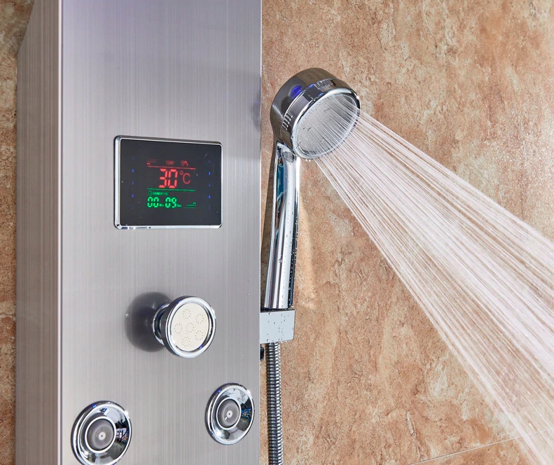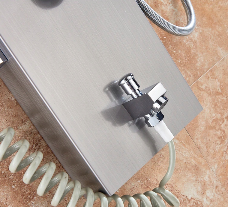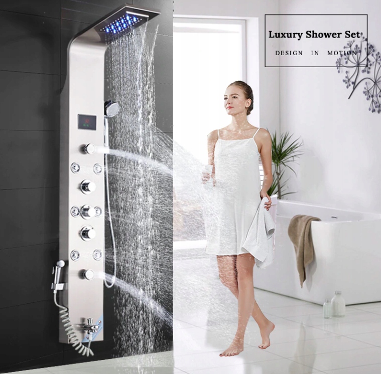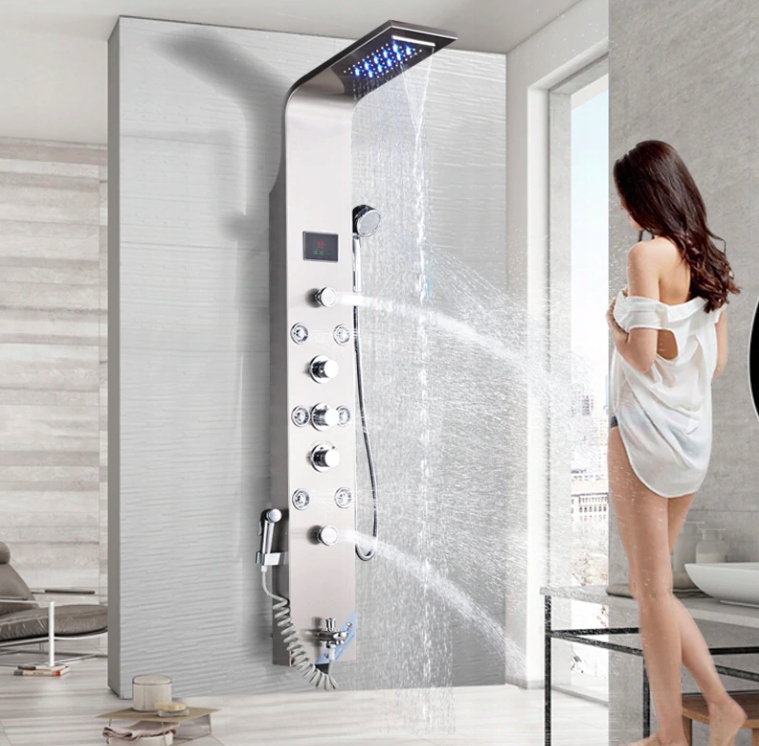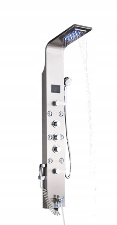 Красива та сучасна багатофункціональна душова панель зі світлодіодним підсвічуванням. Душова панель виготовлена з високоякісної нержавіючої сталі, латуні та матеріалу найвищої якості, який дуже легко підтримувати в чистоті. Панель з тропічним душем і гідромасажем готова до монтажу відразу після отримання. У комплект входить все необхідне для використання панелі. Панель оснащена системою кранів, яка дозволяє точно контролювати як силу і температуру струменя, так і спосіб потоку. Панно виглядає надзвичайно ексклюзивно та елегантно. Він ідеально вписується в оточення та впливає на зовнішній вигляд усієї ванної кімнати. Душова панель з тропічним душем і біде забезпечить вам незабутні відчуття на довгі роки.