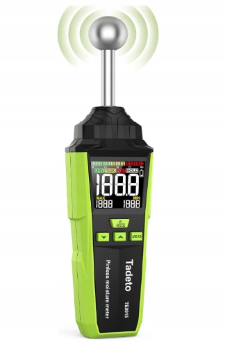 Цей універсальний метр вологості тадето був розроблений для швидкої та точної діагностики вологи в стінах, пластирах, стінах, бетону, штукатурці та деревних та інших будівельних матеріалів. Пристрій поєднує в собі неінвазивний метод вимірювання з подовженою ручкою та точним зупинним зондом, завдяки якому він легко сягає у вузькі, майже доступні місця і перевіряє вологу до 40 мм глибиною. Барвистий, виділений РК -екран з постійною, високою яскравістю забезпечує велику читабельність незалежно від освітлення - результати чіткі з будь -якого кута. Вбудована візуальна та звукова сигналізація попереджає про перевищення встановленого порогу, а графічна шкала в трьох кольорах чітко показує, чи досліджена область суха, ризикована або мокра. М'яке корпус сміття TPE покращує певність зчеплення та стійкість до падінь, а компактна форма полегшує роботу однією рукою та носіння в сумці для інструментів. На задній стінці є стандартна 1/4 дюймова нитка для кріплення аксесуарів або штатива, коли вам потрібно досягти дійсно високих або стабільних вимірювань.