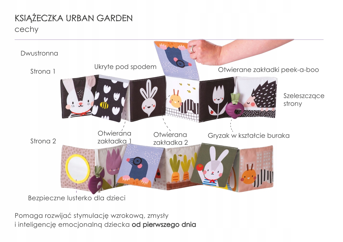 - Двостороння, м'яка, м'ята дитяча книга з нашої колекції Urban Garden для 2 етапів розвитку.