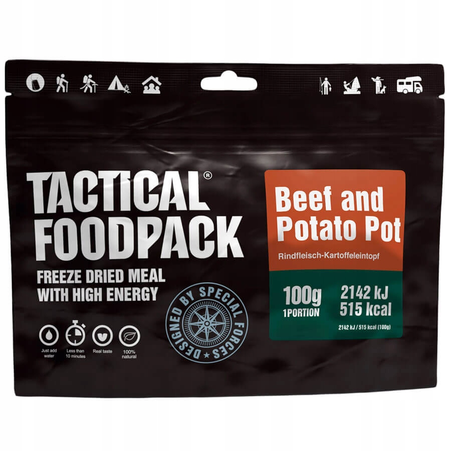 яловичина в редакції бренду тактична їжа. Він пропонує надзвичайно насичений смак, який був отриманий, серед інших через додавання кмину, він ефективно наповнює шлунок і кладе на ноги після тривалої активності. Завдяки яловичини, це багате джерело білка та мінералів, а ретельно відібрана комбінація овочів (картопля, морква, цибуля, помідори, перець) забезпечує необхідні вітаміни та клітковини. Продукт на 100% природний - він не містить консервантів чи штучних добавок. Через безпроблемну передачу та підготовку він ідеально підходить для всіх кемпінгів, походів, а також усіх інших заходів на свіжому повітрі.