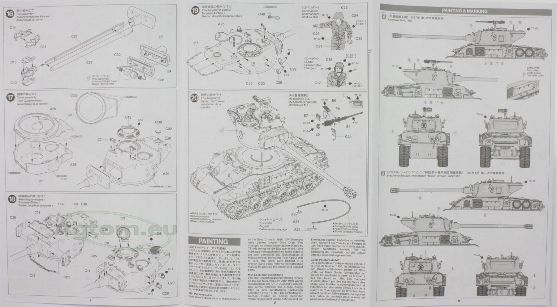 Набір Тамії дозволяє склеїти ізраїльську модифікацію американського середнього танка Шермана - Ішерман M51 з періоду холодної війни. Транспортний засіб було модифіковано в 1960 -х роках, змінивши головне озброєння на величезну гарматну гармат 105 мм та об'єднання шасі до версії HVSS. Комплект також включає 2 екіпажі - командир та зарядку.