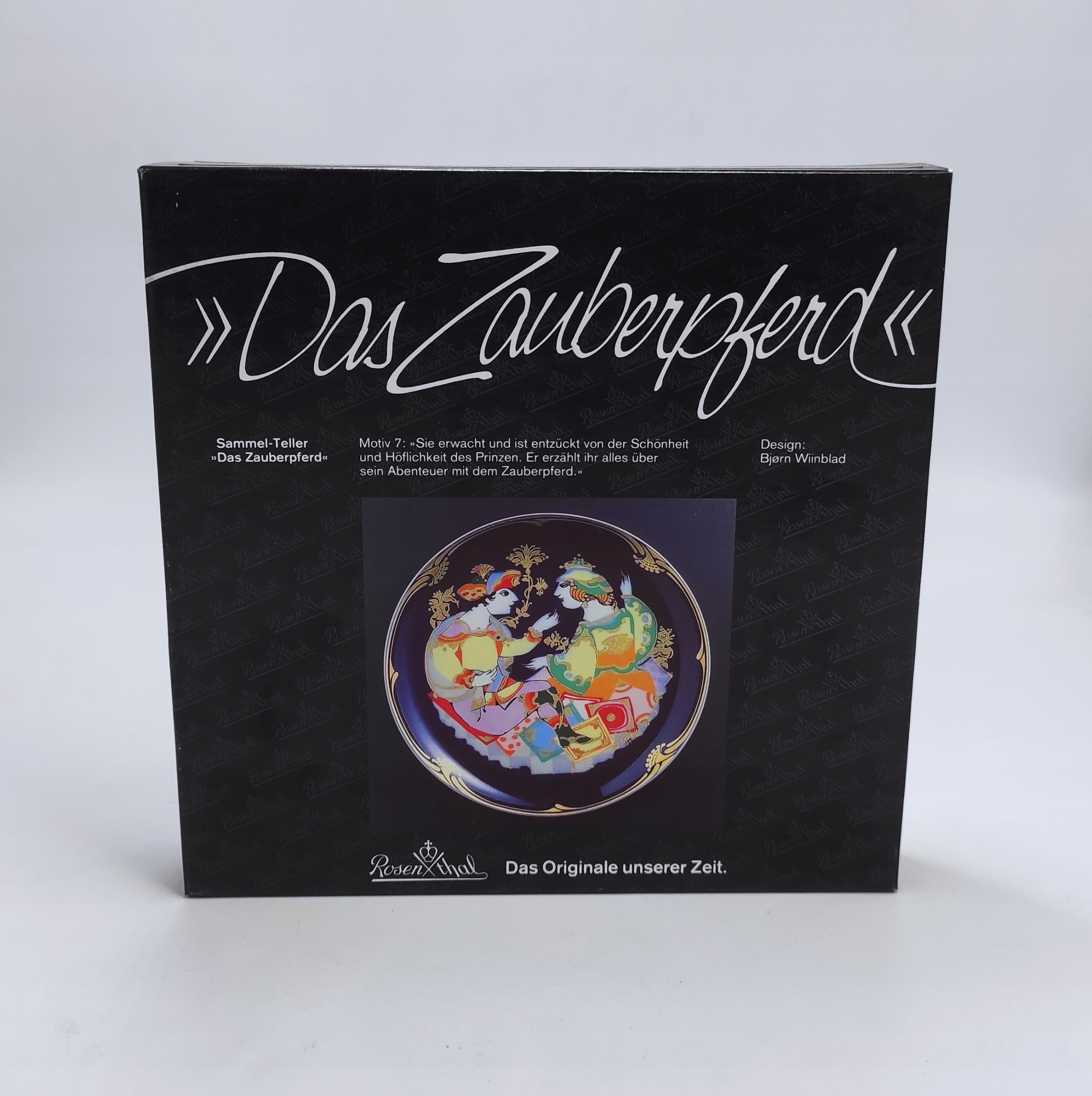 Тарілка походить з колекції ENCHANTED HORSE з Arabian Nights і має номер 7. Вона виготовлена з порцеляни найвищої якості та прикрашена чудовими кольорами. Пофарбована в глибокий кобальтовий синій колір з красивою позолотою та казковим мотивом. Позолота фантастично гармонує з сильними, яскравими кольорами та чудово відбиває світло, якщо дивитися під прямим кутом. Бьорн Війнблад – датський художник, який ставить фантазію вище простоти та здорового глузду, що чітко видно в його казкових дизайнах, якими він дуже відомий.