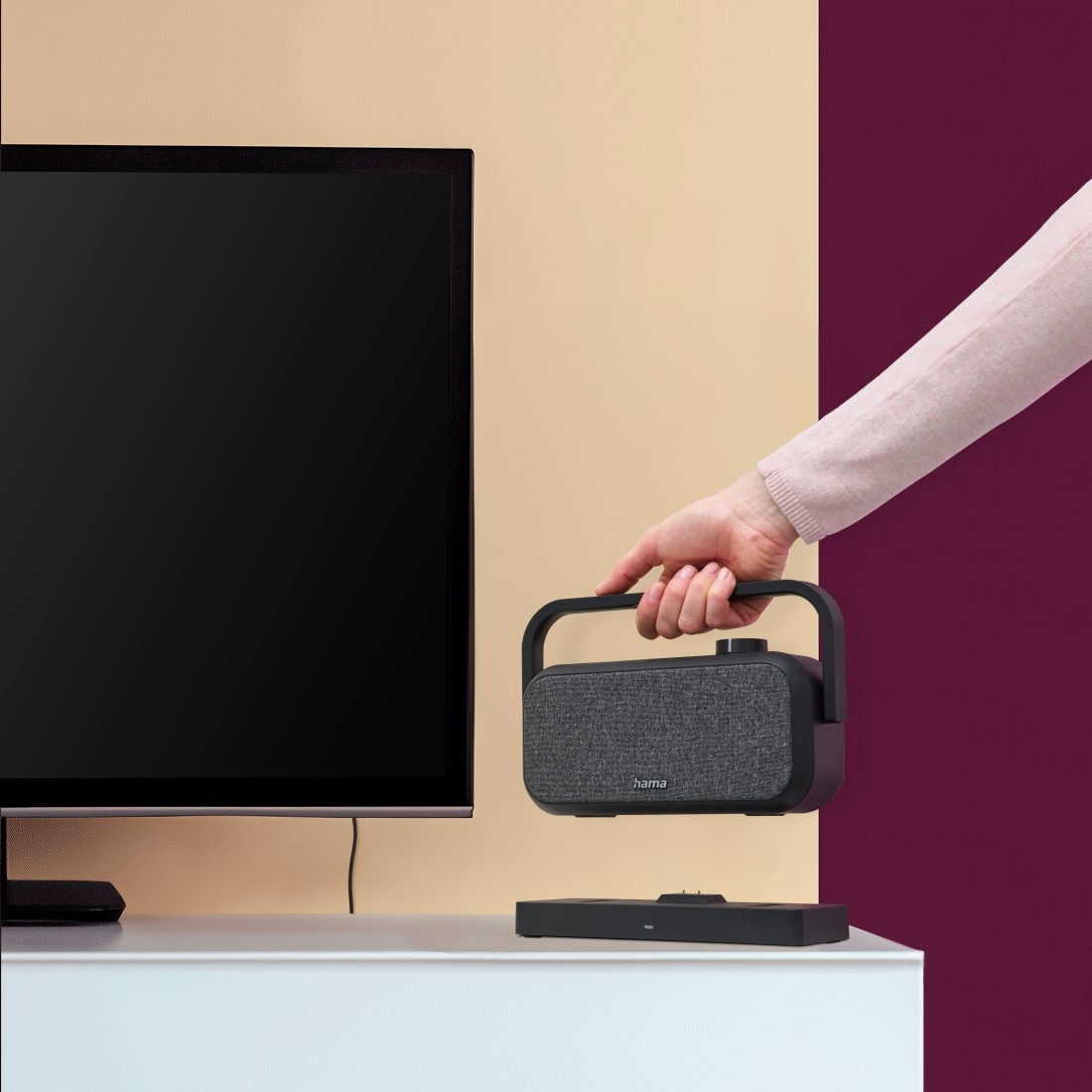 Заряджання, передача даних, зберігання: ця зарядна станція передає аудіосигнал і служить тримачем для бездротового динаміка, коли він не використовується
