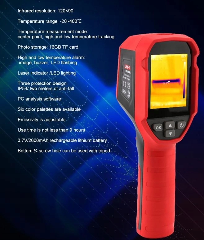 Тепловізор широко використовується в медицині, археології, транспорті, сільському господарстві, електроніці... камера поєднує в собі функції вимірювання температури поверхні та тепловізор у реальному часі, які чітко відображаються на екран.