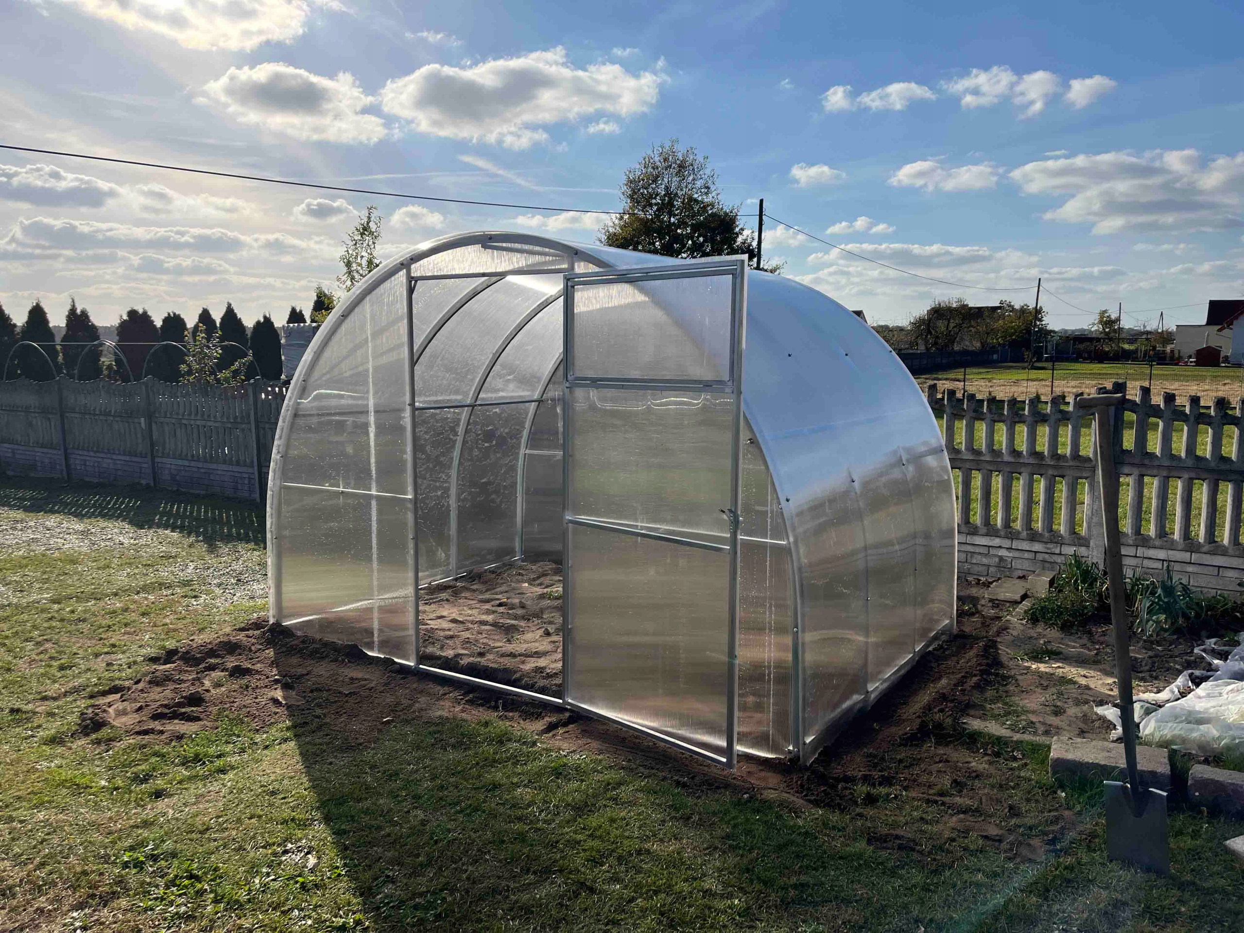 Сучасна та проста в установці конструкція зі сталі 0,8 мм, оцинкована гарячим способом з обох сторін. Арки зроблені з одного елемента - вони зігнуті, фасади зварені. У набір входять Т-подібні анкери для кріплення до землі та набір шурупів. Чохол виготовлений із стійкого полікарбонату, стійкого до УФ-випромінювання та граду. Напівкругла форма теплиці запобігає накопиченню снігу