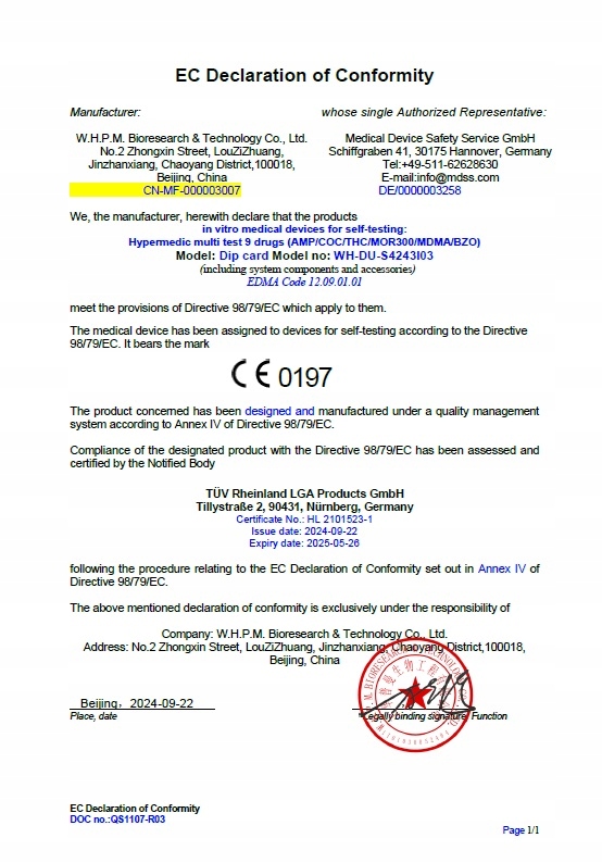 Усі тести Hypermedic ® продаються в герметиці, забезпечуючи упаковку найвищої якості. Сертифікат якості CE, необхідний в Європейському Союзі, виданий повідомленим номером TUV підрозділу 0197.