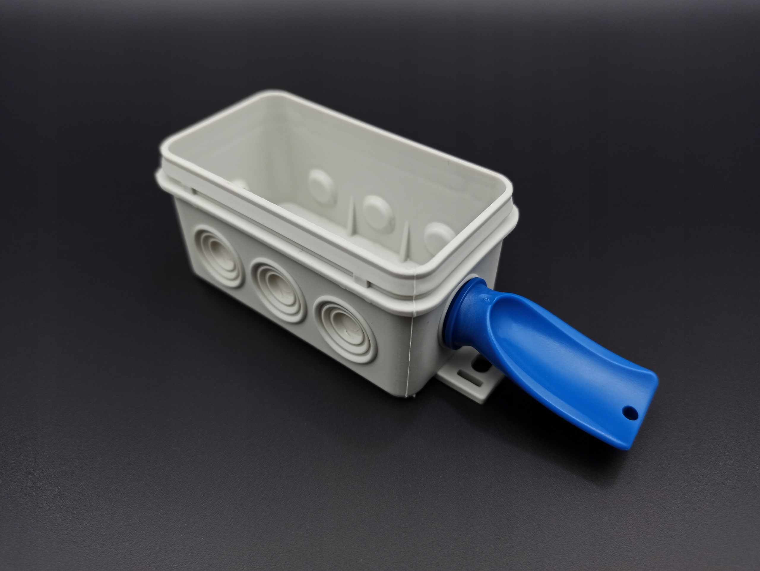 ОТВОР ДЛЯ НАКЛАДНИХ БАНОК З ТВЕРДОГО ПЛАСТИКУ, СИНІЙ. РУЧКА МАЄ ОТВОР ДЛЯ ШНУРКА АБО ПОВІДЦЯ. ВІН МАЄ ДВА ЕТАПИ ВИРІЗАННЯ ОТВОРУ.