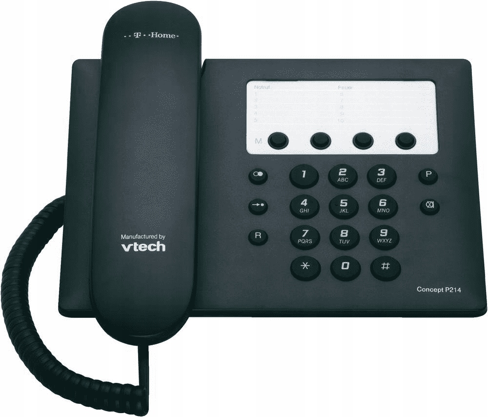 дротовий телефонконцепція Telekom P214 Чорний аналоговий провід, 3 цільові кнопки, червоний, відключений. Аналоговий базовий телефон для стандартного з'єднання. Має основні функції, такі як швидкий вибір та повторний вибір.