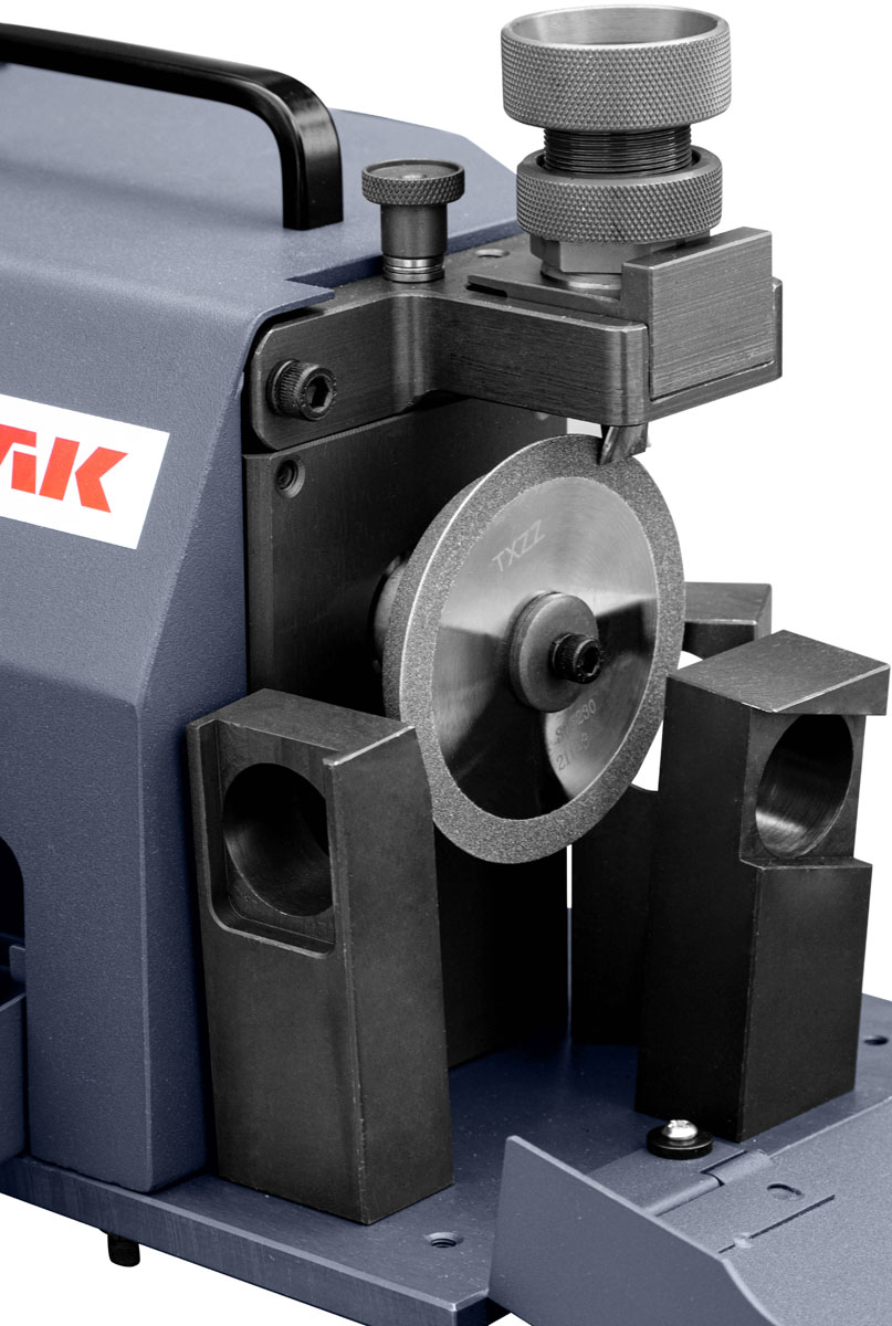 Верстат для заточування торцевих фрез 4-14 мм з алмазним диском, що дозволяє точно заточувати фрези на 2, 3 або 4 леза, і від діаметра 12 мм з 6 лезами та простим керуванням.