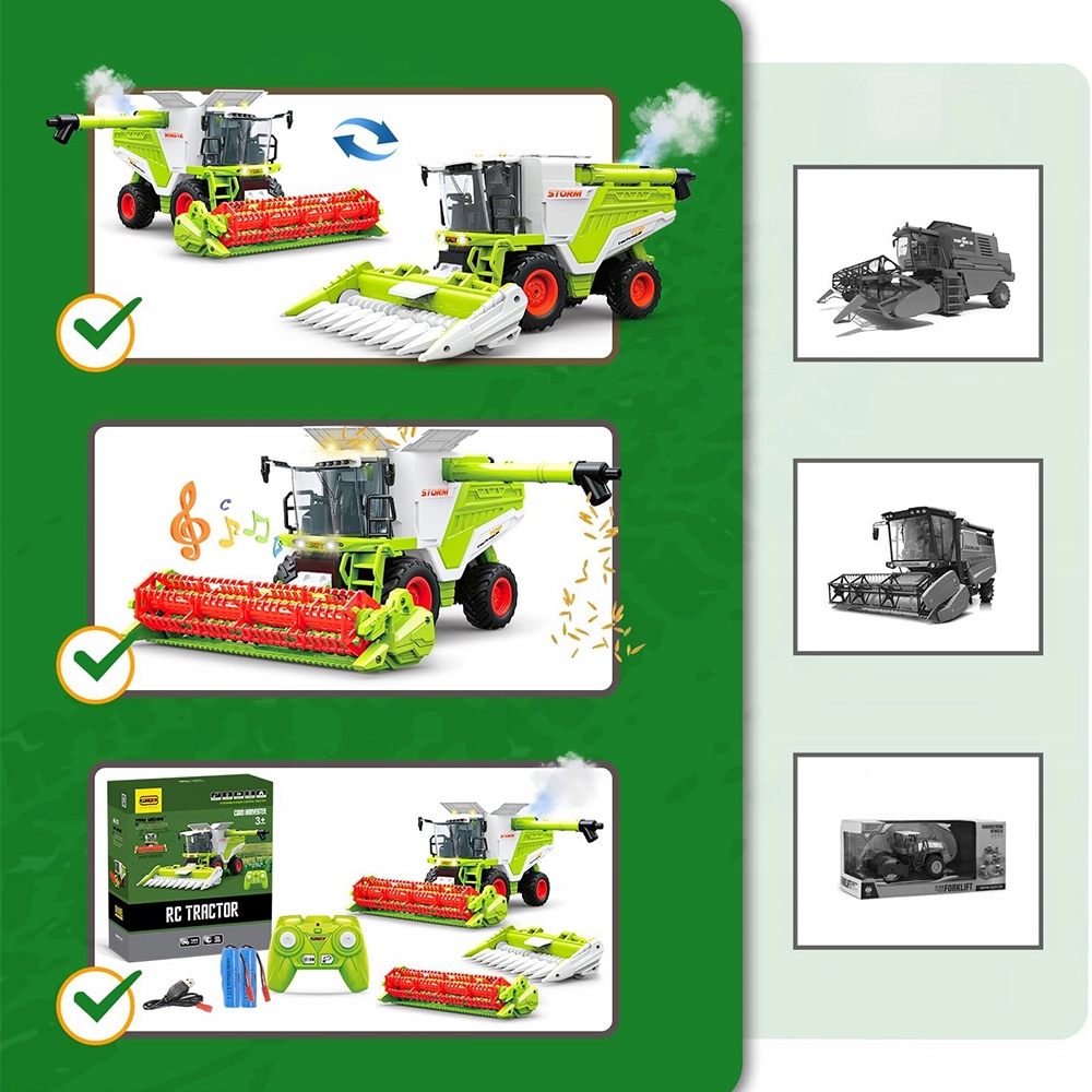 Цей пульт -керований комбайн -ідеальна іграшка для маленьких та великих любителів сільського господарства! Завдяки дистанційному керуванню 2,4 ГГц, звуковим та легким ефектом та способу роботи з димом, задоволення стає ще більш реалістичним та звикаючим.