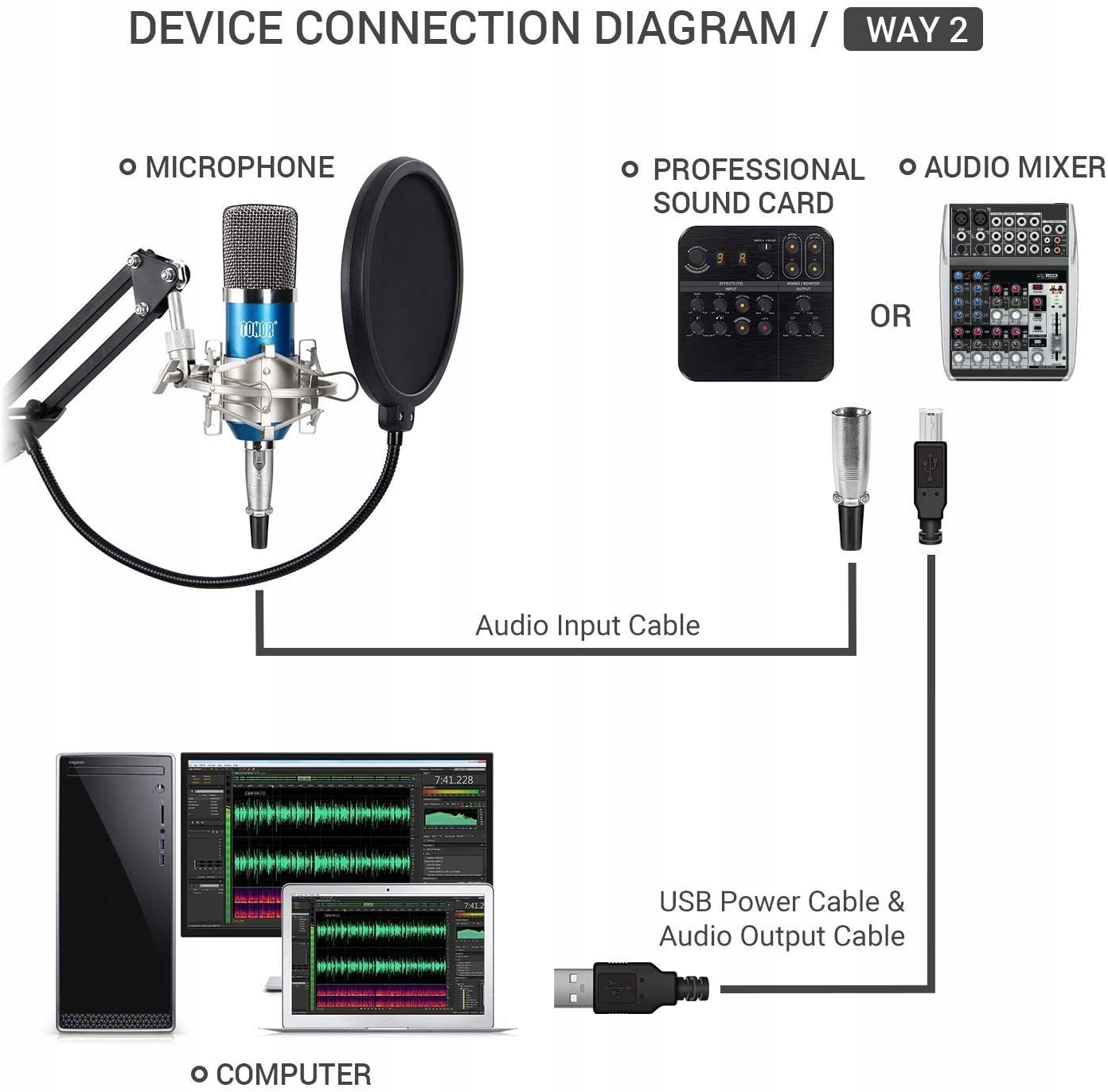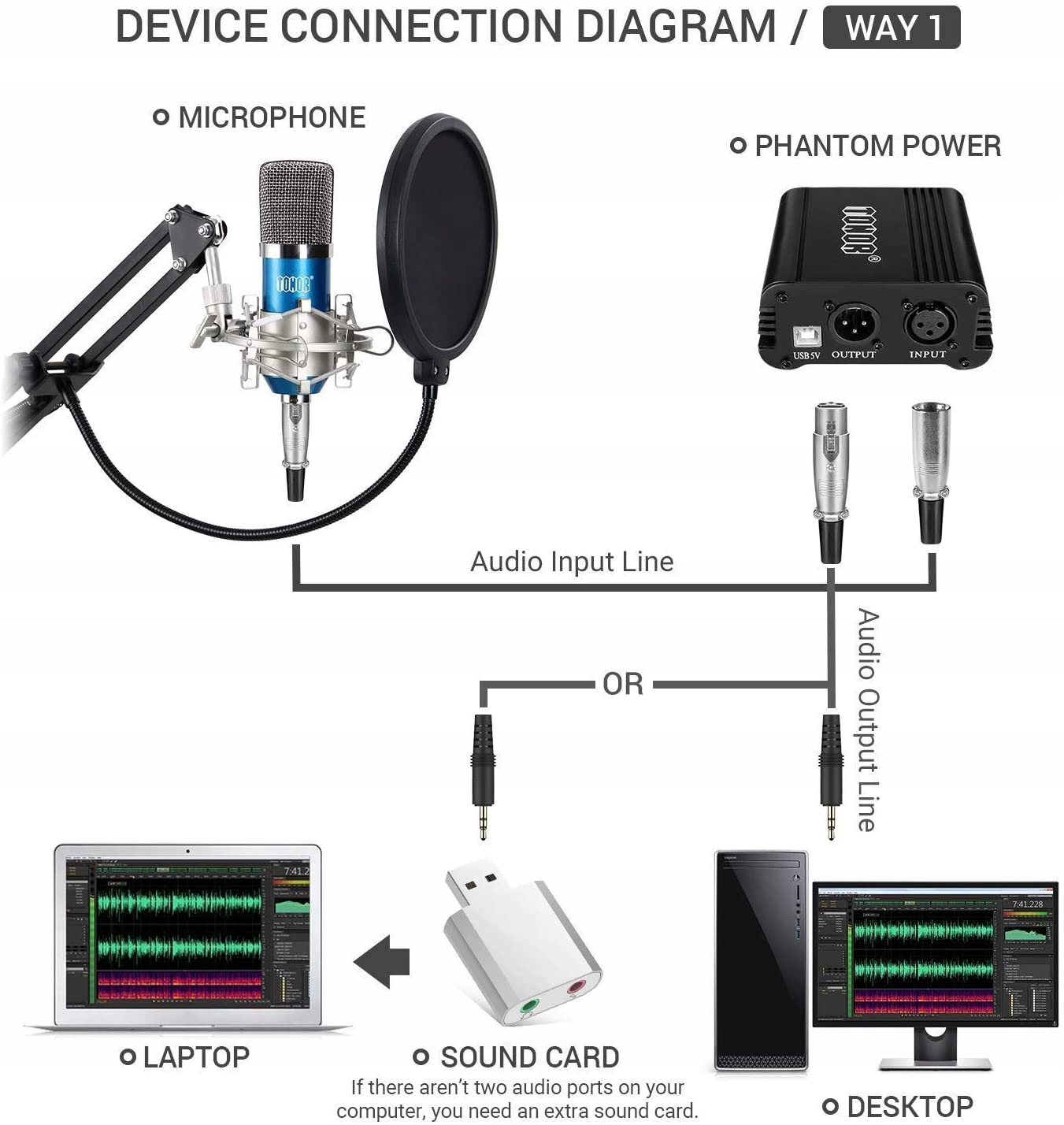 ♫ ♫ Як підключитися: Якщо ваш ноутбук не має вхідного аудіопорту, вам потрібно підключити фантомне живлення до ноутбука через звукову карту. Якщо ви хочете під’єднати його до мікшера, вам потрібно під’єднати мікрофон до мікшера за допомогою кабелю XLR «папа» та «мама».