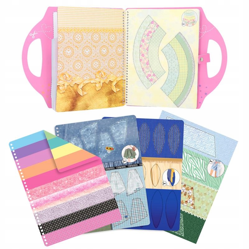 Кишенькова книжка-розмальовка TOPModel із застібкою на кнопці містить 20 сторінок фігур моделей, 20 аркушів чудових візерунків тканини, 5 сторінок наклейок, 1 сторінка атласних наклейок і 1 сторінка наклейок з фольги.