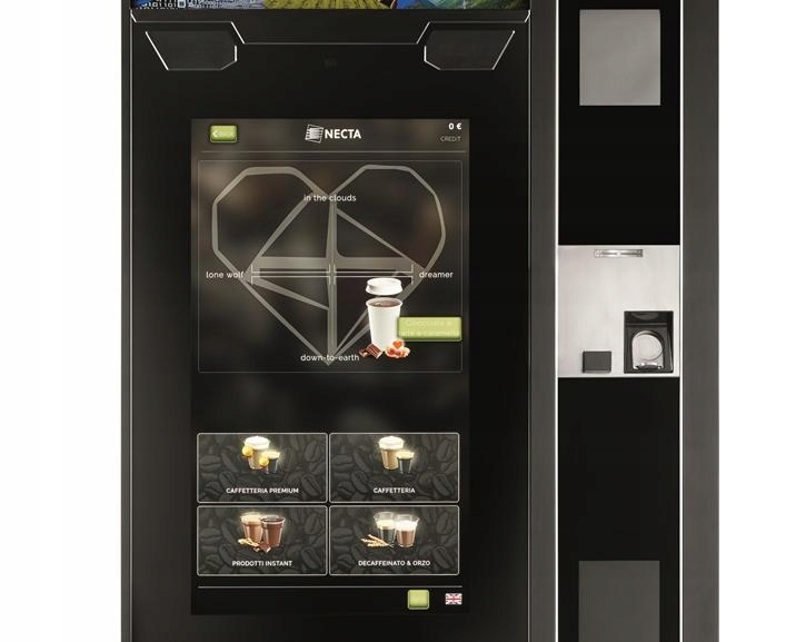 Торговий автомат Necta Maestro Touch — це елегантний автомат із чорними анодованими алюмінієвими зовнішніми профілями, чорними дверцятами й темно-сірим корпусом, а також безрамним повністю скляним сенсорним екраном. Це нова висококласна модель автомата з гарячими напоями. Maestro Touch зосереджується на передових рішеннях, тому він може адаптувати напої до найвибагливіших споживачів і має можливість відображати інформацію про харчову цінність, щоб визначити продукт, який найбільше відповідає їхнім потребам.