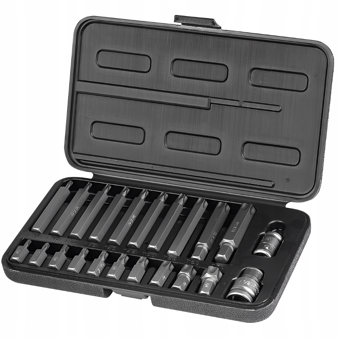 Набір із 22 предметів, включаючи: довгі насадки TORX, короткі насадки TORX, дві частини тримачів ½" і 3/8".