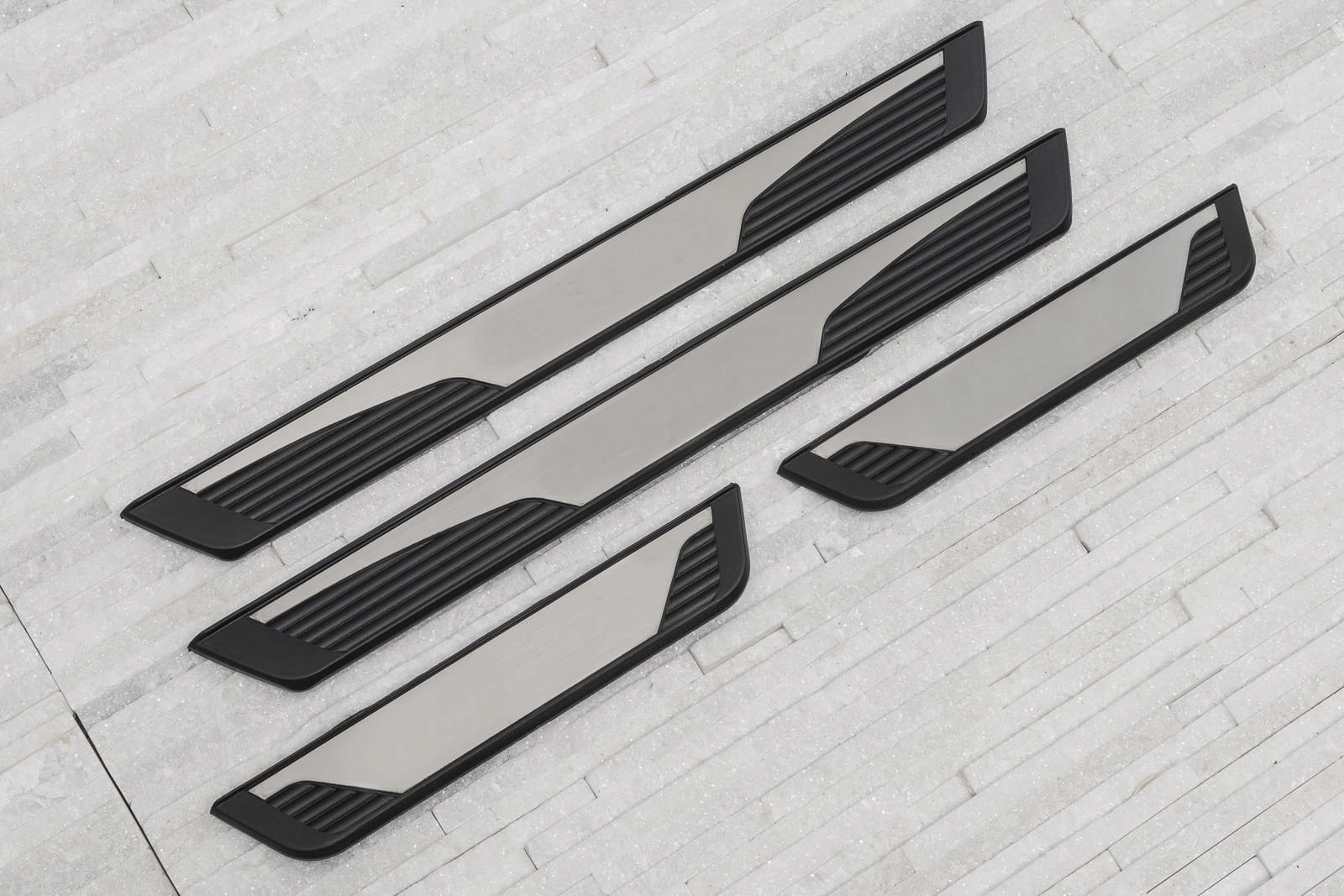 Планки кріпляться на пофарбовані частини внутрішніх порогів. Вони доповнюють внутрішню лінію дверей і надають поріжку спортивно-елегантний вигляд. Дана модель привертає увагу декоративним, світовим написом. Завдяки вбудованому світлодіодному підсвічуванню елемент не тільки підкреслює сучасний стиль автомобіля, але й підсвічує зону порогів, полегшуючи посадку та вихід.
