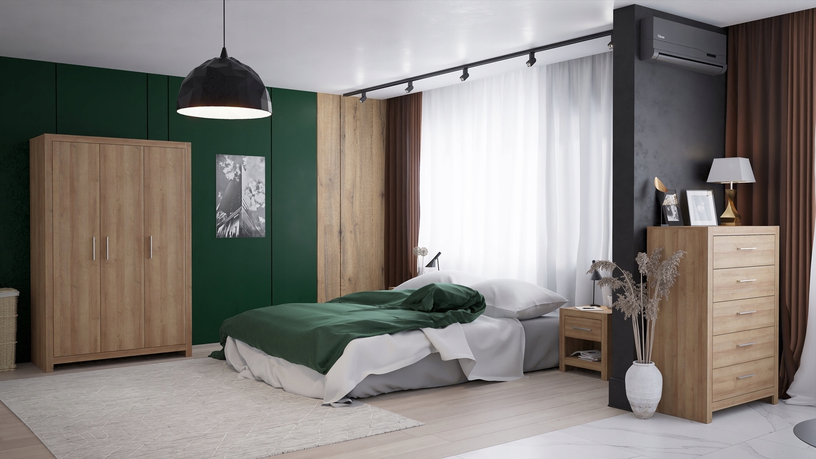 Набір доповнюється стильною комодом для спальні з п’ятьма містками, ідеально підходить для організації одягу та особистих аксесуарів. Крім того, набір складається з двох нічних батьків 45 см завширшки, кожна з яких з однією ящиком та полицею, які забезпечують зручний доступ до найнеобхідніших речей у ваших пальцях.