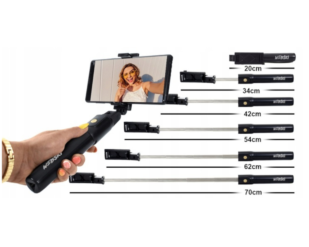 Штатив для палиці для селфі з пультом дистанційного керування Bluetooth — ідеальний гаджет для людей, які часто знімають прекрасні моменти життя за допомогою смартфона. Ручка виготовлена з алюмінію, поліуретану та твердого полікарбонату. Універсальний характер пристрою складається як з підключення Bluetooth, так і з висувної ручки. Ручка пристрою розділена на три ніжки, які в розкладеному стані створюють якісний штатив, оснащений спеціальним нековзким наконечником.