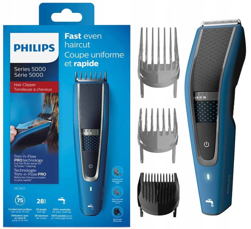Досягніть рівномірного зрізу за допомогою технології DualCut і Trim-n-Flow-PRO. Нова конструкція гребінця запобігає забиванню гребінця волоссям будь-якої довжини. Машинка має подвійні самозаточувальні леза з нержавіючої сталі. Повний заряд триває до 75 хвилин без кабелю.
