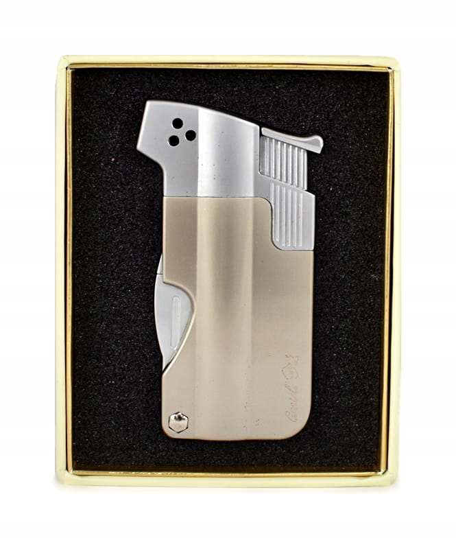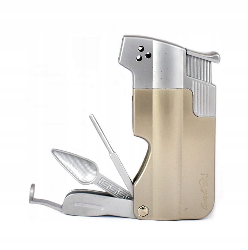 Унікальна запальничка з гладкою обробкою, що надає їй елегантного характеру. Додатковими перевагами є оригінальний механізм запалювання та трикомпонентний ящик для інструментів. В органайзер входять три елементи: трамбовка - для тютюну при наповненні і вугілля під час куріння, плунжер - для розблокування і очищення горловини, а також ложка - для чищення і вишкрібання димоходу після куріння. Запальничка розміщена в декоративній коробці, оснащена вентилем для заправки газу та регулювання потужності полум'я.