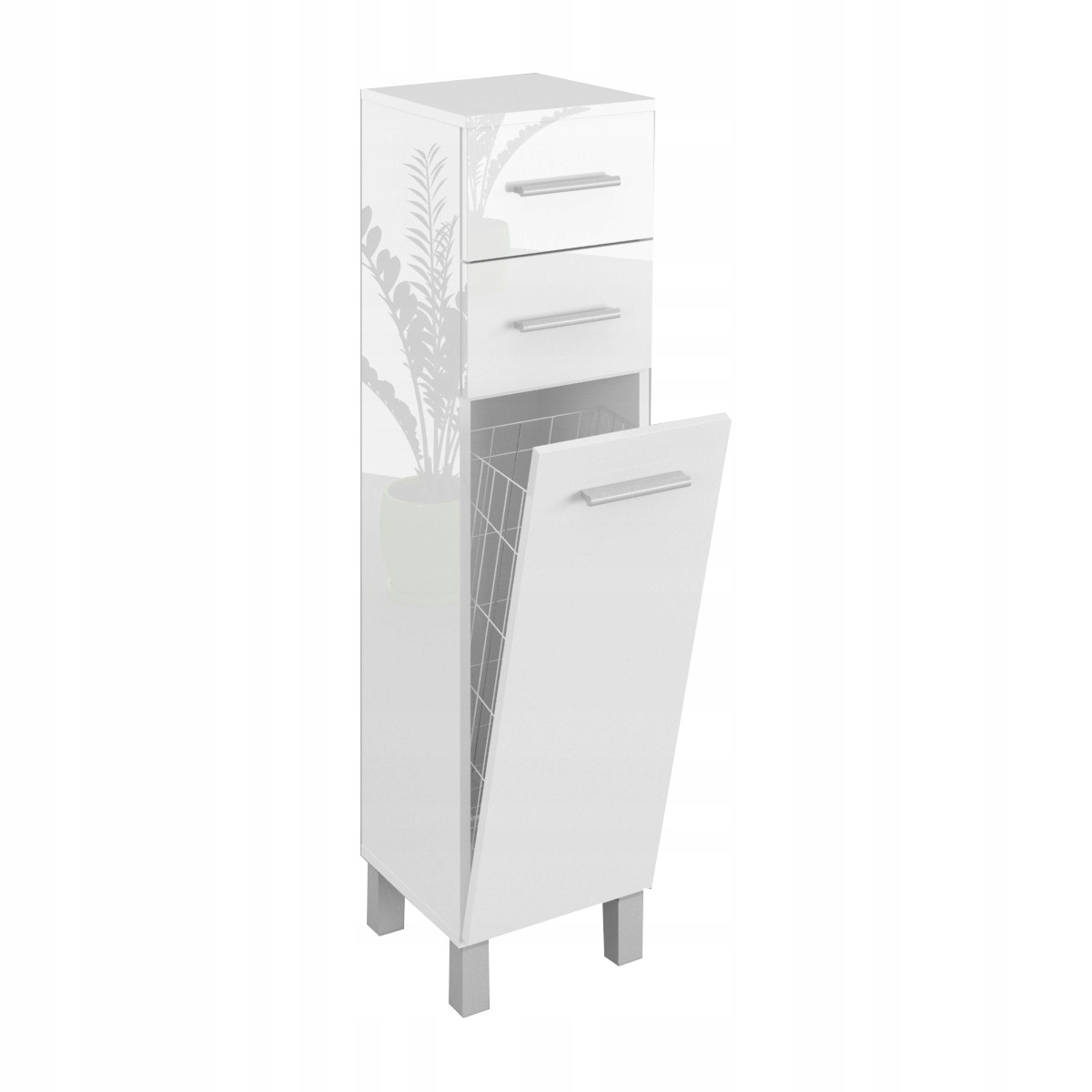 Шафа для ванної кімнати, оснащена двома ящиками та кошиком для білизни, ящики на роликових напрямних. Шафа виготовлена з високоякісної МДФ плити з УФ-лаком і ламінованої плити. Краї покриті ПВХ бортиком. Висока якість глянцю понад 100 голосів. Глянцеві елементи покриті захисною плівкою. Меблі готові до самостійної збірки, яка є простою та інтуїтивно зрозумілою, в її основі лежить система дюбелів та ексцентриків, які не потрібно склеювати, виріб можна розібрати та зібрати в будь-який час, в упаковці є інструкція з експлуатації на 3 мовах. Боковини шафи однорідні без отворів зовні, що підвищує естетичність виробу.