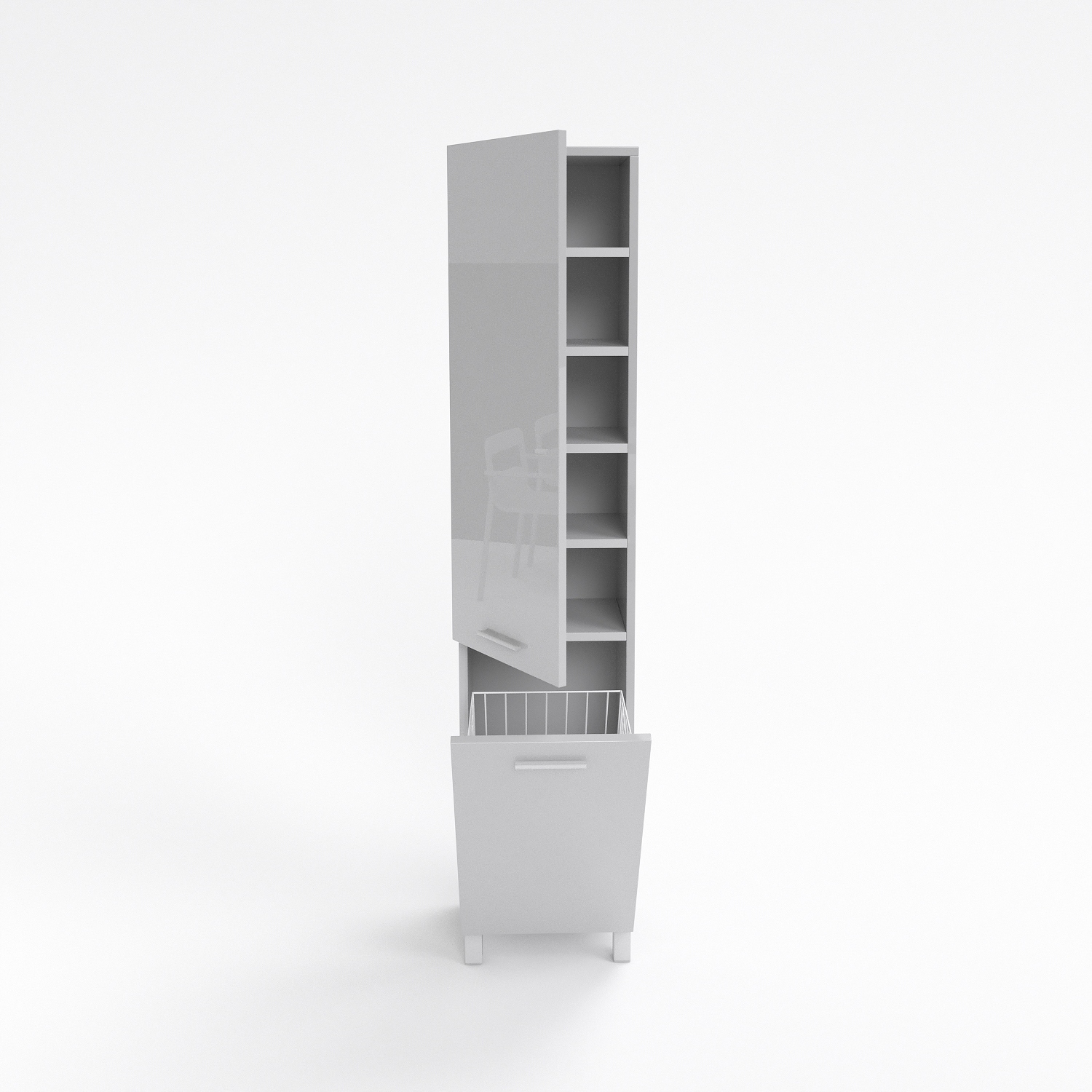 Шафа, стійка з кошиком для брудної білизни. Верхня частина оснащена регульованими полицями. Шафа виготовлена з високоякісної МДФ плити з УФ-лаком і ламінованої плити. Краї покриті ПВХ бортиком. Висока якість глянцю понад 100 голосів. Глянцеві елементи покриті захисною плівкою. Меблі готові до самостійної збірки, яка є простою та інтуїтивно зрозумілою, в її основі лежить система дюбелів та ексцентриків, які не потрібно склеювати, виріб можна розібрати та зібрати в будь-який час, в упаковці є інструкція з експлуатації на 3 мовах. Боковини шафи однорідні без отворів зовні, що підвищує естетичність виробу. Шафа підходить для підвішування . Ми не використовуємо кришки всередині, щоб зменшити кількість пластику. Після упаковки шафи все одно технологічних дірок не видно. Упаковано по 2 упаковки