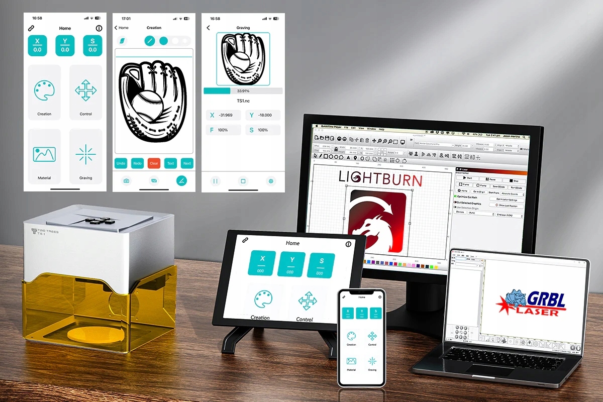 підтримує передачу файлів гравірування через USB або Bluetooth кабель, материнська плата має власну функцію масового зберігання в хмарі, повторювану гравюру одним клацанням та офлайн -гравюром. Відповідно до таких операційних систем: Lightburn (OS OS/Mac OS/Linux), LaserGrbl (OS Windows, MacOS ще не підтримується).
