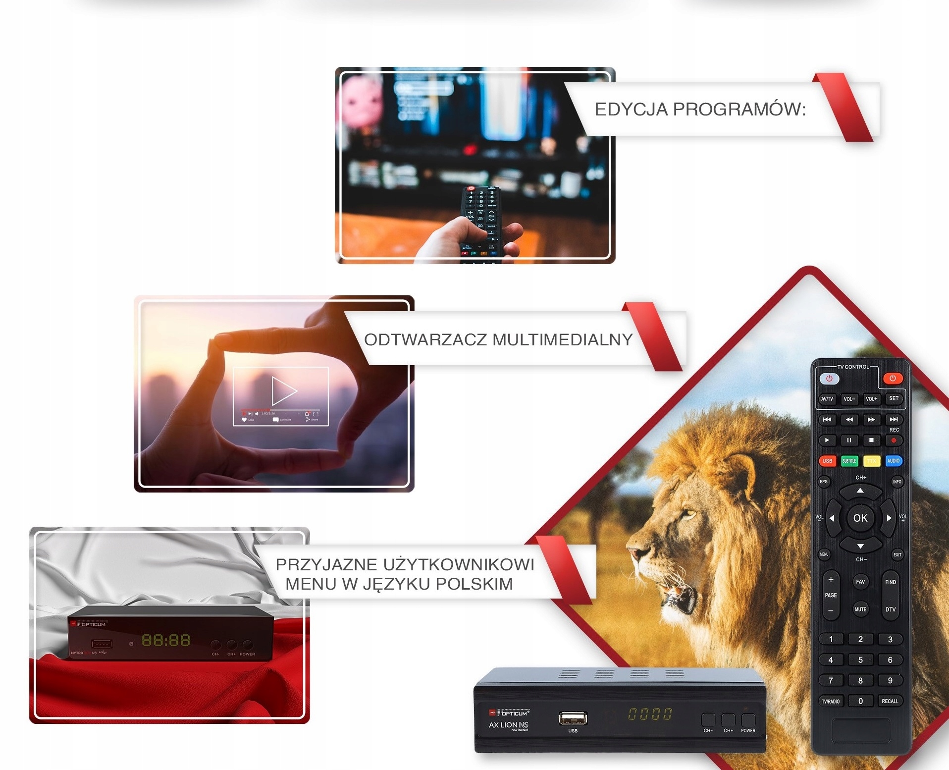 Приймач має багатомовний екранний меню і дозволяє відтворювати мультимедійні файли через USB.
