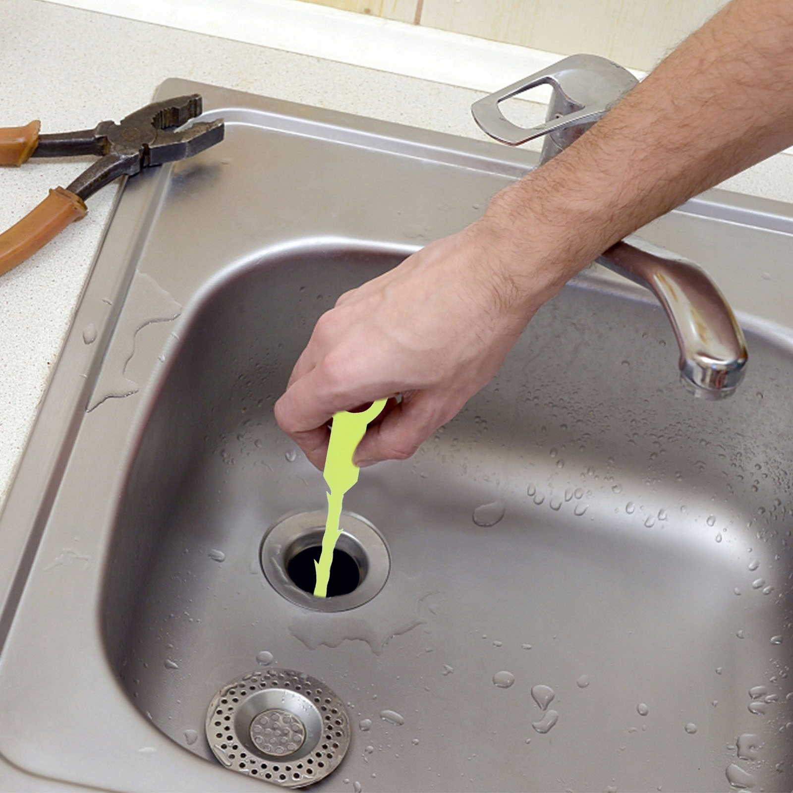 Засіб для видалення забитого волосся достатньо довгий, щоб проникнути глибоко в труби раковини.