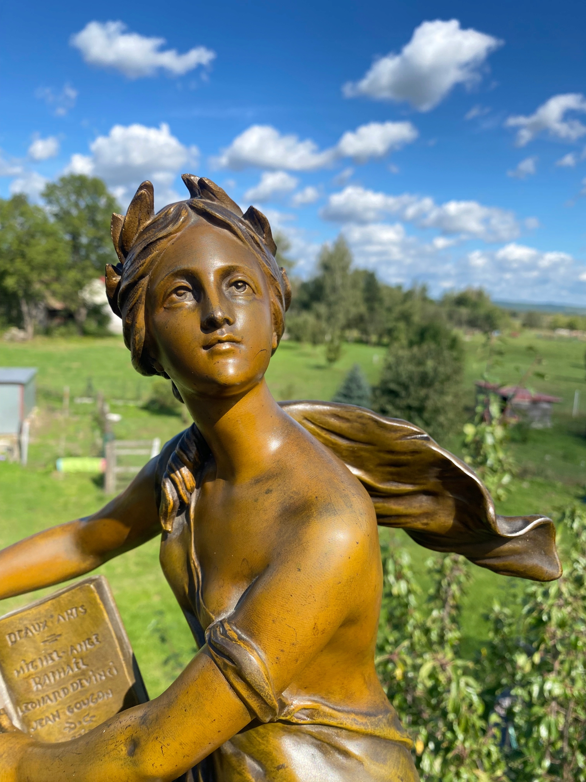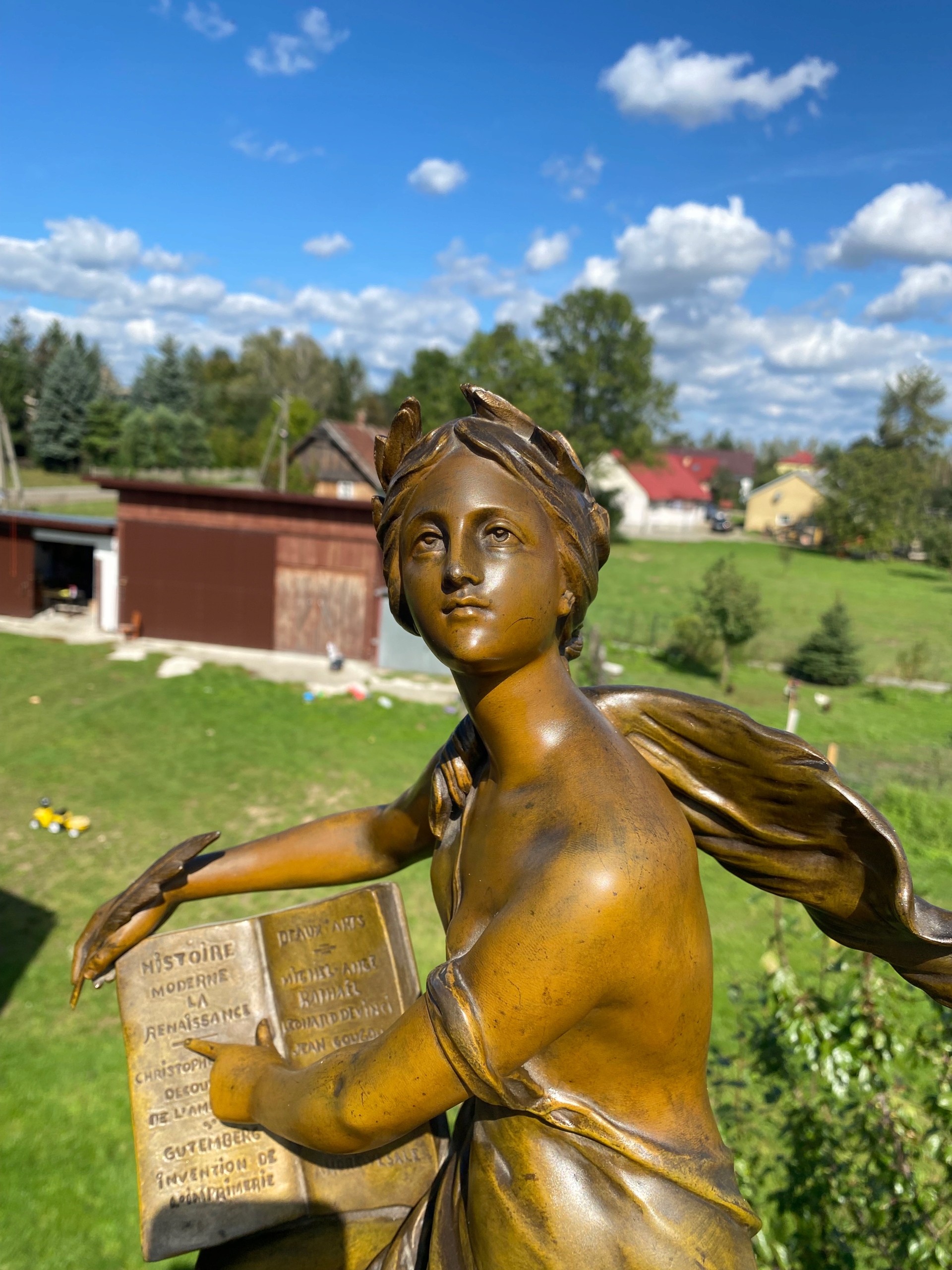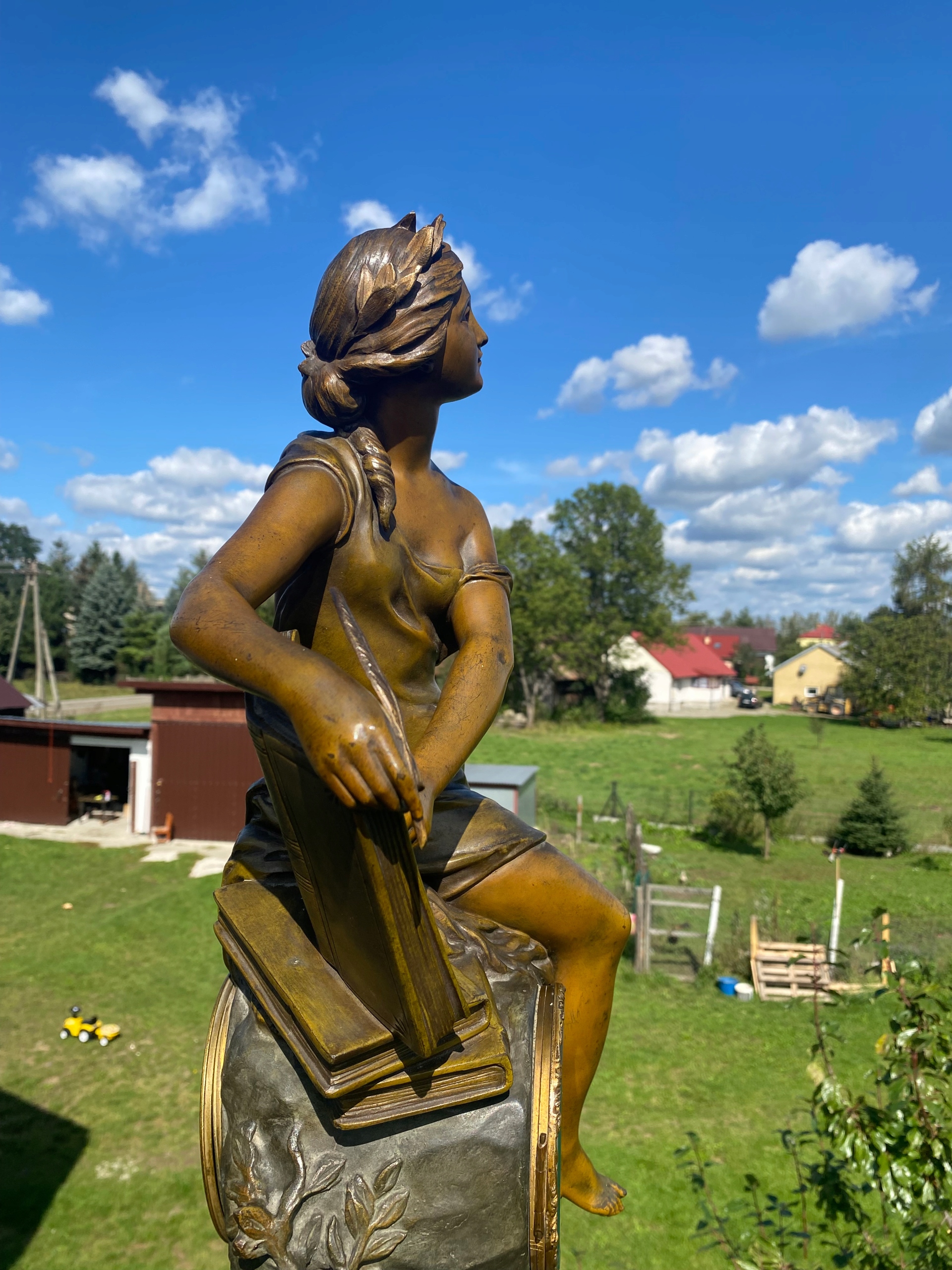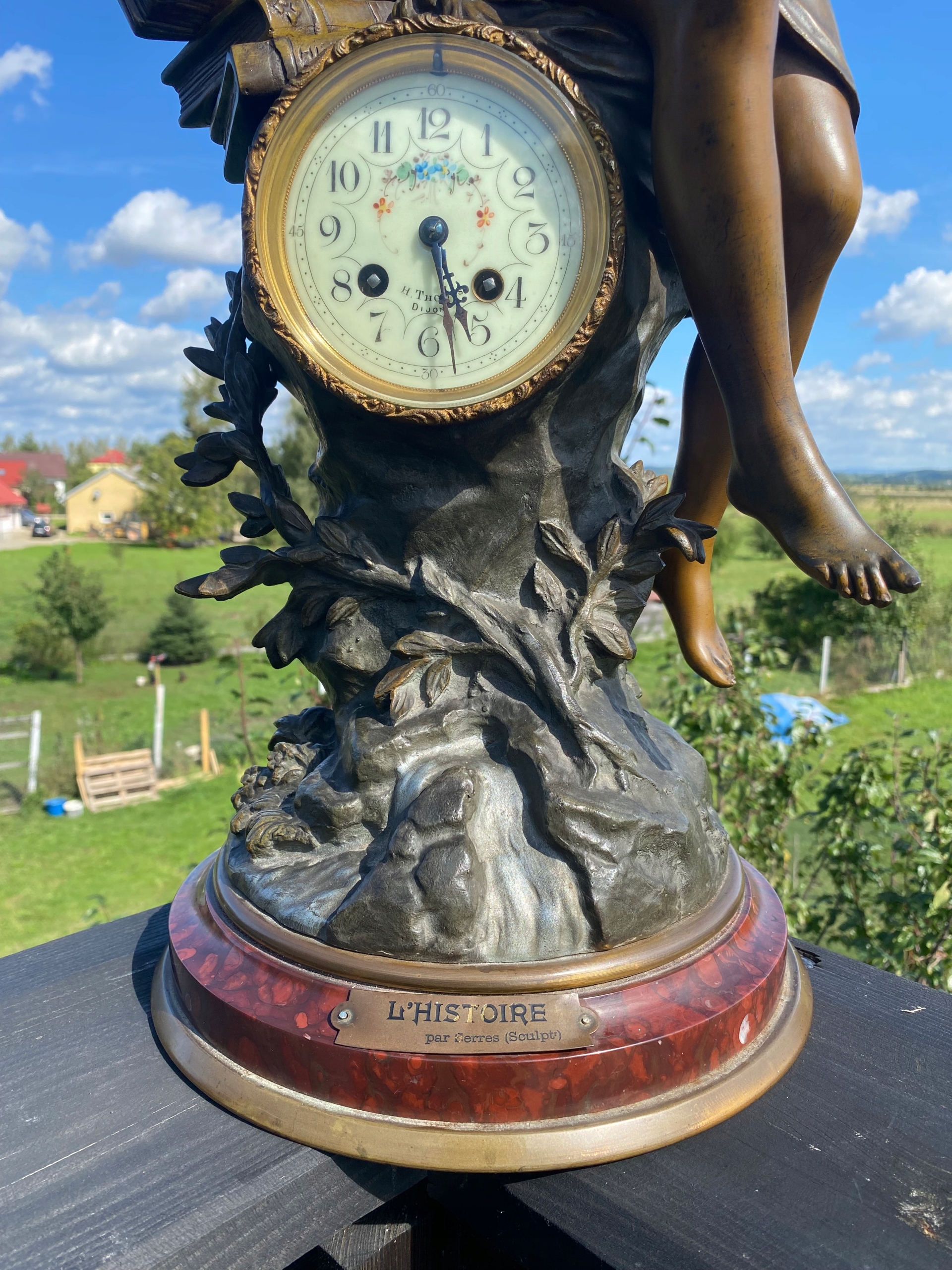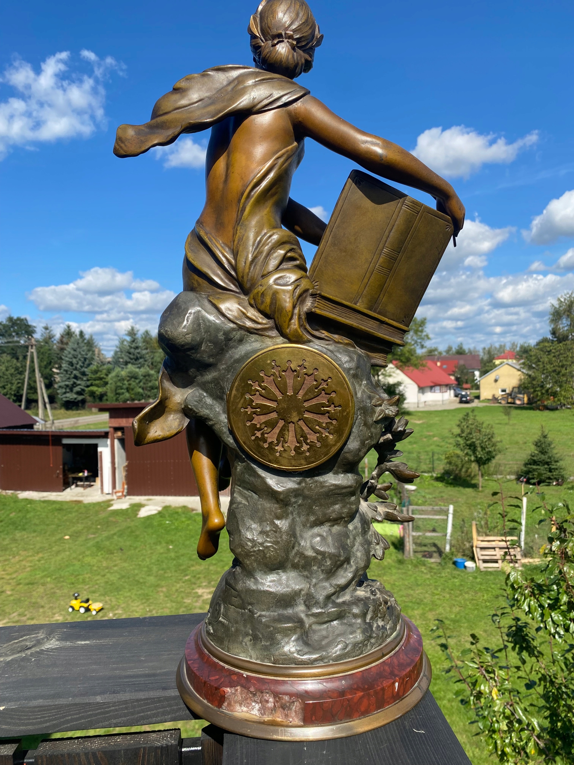 У мене продається прекрасний і великий камінний годинник із зображенням сидячої жінки за механізмом з ручкою та відкритою книгою на купі книг.