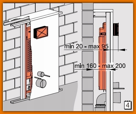 Система прихованого монтажу для сухого будівництва (гіпсокартон). Каркас для закладення гіпсокартонних плит в конструкцію. Конструкція рами дозволяє закріпити його в конструкції гіпсової стіни або встановити перед стіною. Це універсальний модуль для підвішування чаші з кроком шурупів 180 і 230 мм. Рама з телескопічними ніжками дозволяє регулювати висоту унітазу в межах 200 мм. Якість рами та її обробка забезпечують тривалий термін служби. Встановлений модуль, прикріплений до гіпсокартонної конструкції та підлоги, має достатню міцність, немає необхідності використовувати додаткові елементи зміцнення.